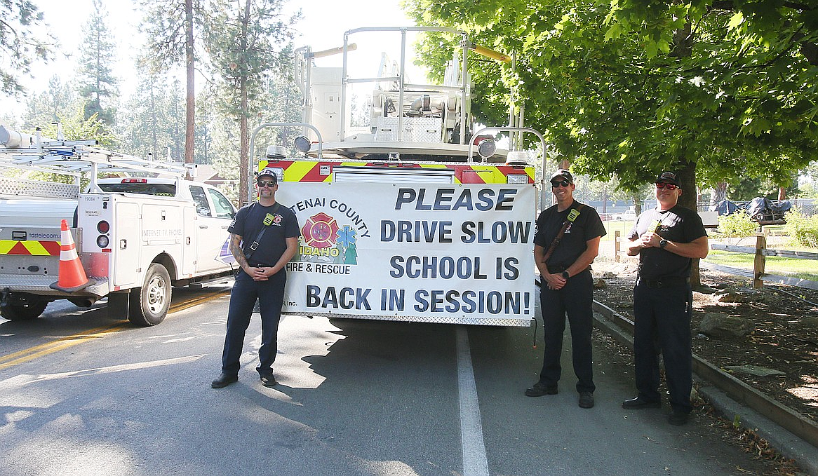 From left, Ryan Jaderquist, Sam LaPresta and Colter Smart of Kootenai County Fire and Rescue remind drivers near Ponderosa Elementary School in Post Falls to slow down at the start of the 2022 school year.