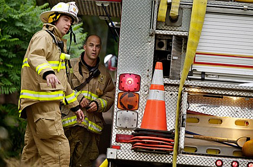 On the first day as Mica Kidd Island Fire Protection District fire chief July 21, 2011, Jason Blubaum orchestrates a fire scene during a structure fire near Kidd Island Bay. Blubaum later left to accept a position at the local Idaho State Fire Marshal's Office.