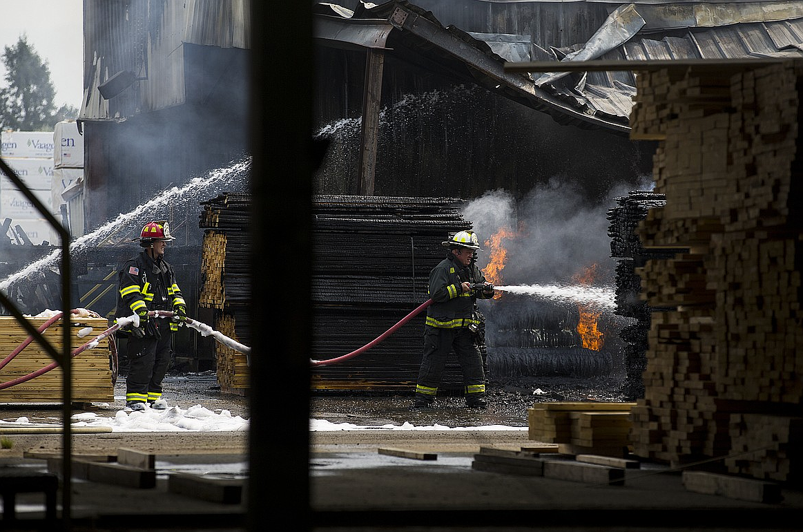 Northern Lakes Battalion Chief Kevin Croffoot, right, lends a hand to fight a fire at Merrit Bros. Lumber Company in Athol in this 2017 photo.