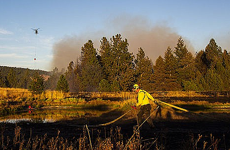 Worley Firefighter Dan Mooney pulls up a firehose as his engine moves locations to fight a wildfire near Fighting Creek in October 2014.