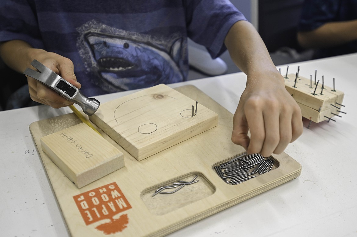 The first day included learning how to use tape measures and hammers. Kids made porcupines out of blocks of wood and nails. By the end of the week, the students would make keepsake boxes.
