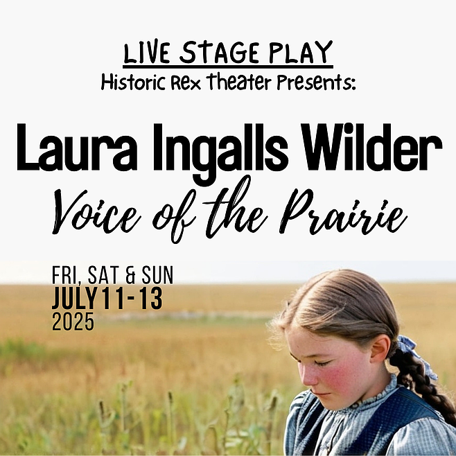 The first event is the children’s stage play “Laura Ingalls Wilder: Voice of the Prairie,” presented as part of the Rex Theater Children’s Program. The play opens Friday, July 11, at 7 p.m., with additional performances on Saturday, July 12, at 7 p.m. and Sunday, July 13, at 2 p.m.