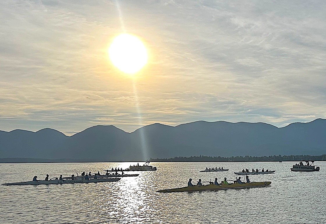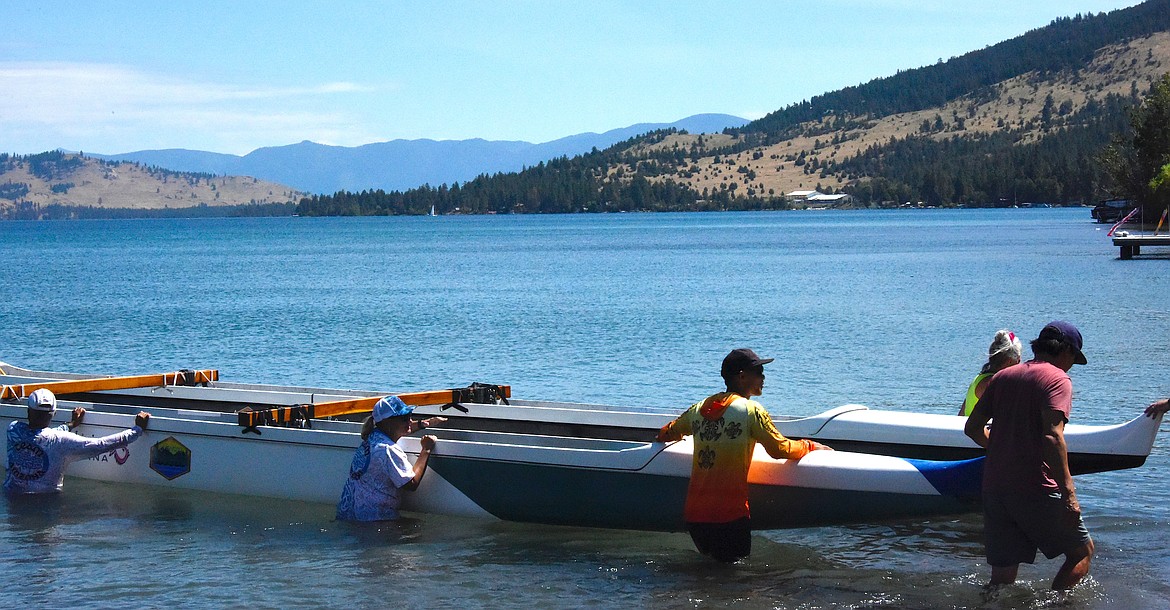 Early Saturday morning the paddlers launched six-person outrigger canoes and some smaller outriggers and headed from the Polson Fairgrounds up Flathead Lake and around Wild Horse Island on a 25-mile point-to-point paddle to their landing spot at the Big Arm Canoe Club. Mother Nature cooperated with sunshine and blue skies but tossed some small waves and gusts of winds in to keep things interesting. According to one Hawaiian participant, “It was a lovely paddle.”
