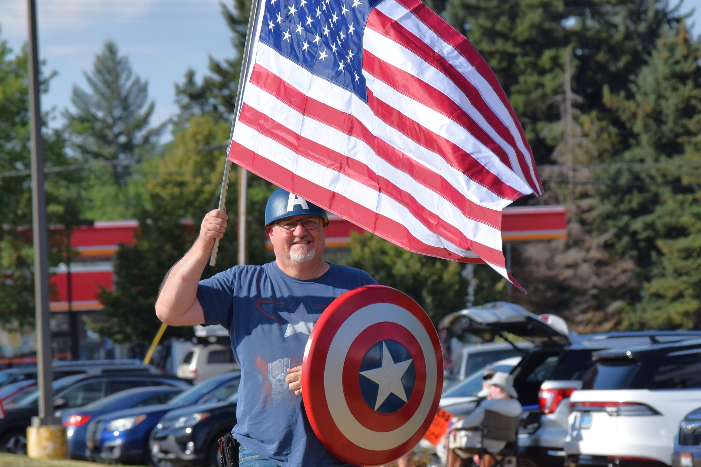 In similar spirit, Coeur d’Alene resident Mikal Johnson was dressed as Captain America as he carried a large American flag.