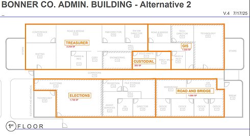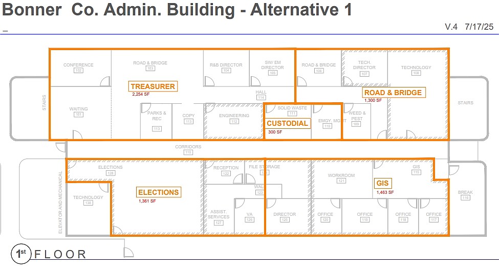 During a Tuesday business meeting, Bonner County project engineer Spencer Ferguson presented two alternative plans for a remodel design inside the county administrative building, both of which moved the treasurer’s office to the first floor.