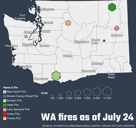 Wildfires are the most prevalent cause of air polition in Washington, according to the Washington Department of Ecology. Fires like the Burdoin Fire and those fires below are contributing to hazy conditions statewide. Air quality in Central Washington remains good, but may present challenges for those who are sensitive to air quality.