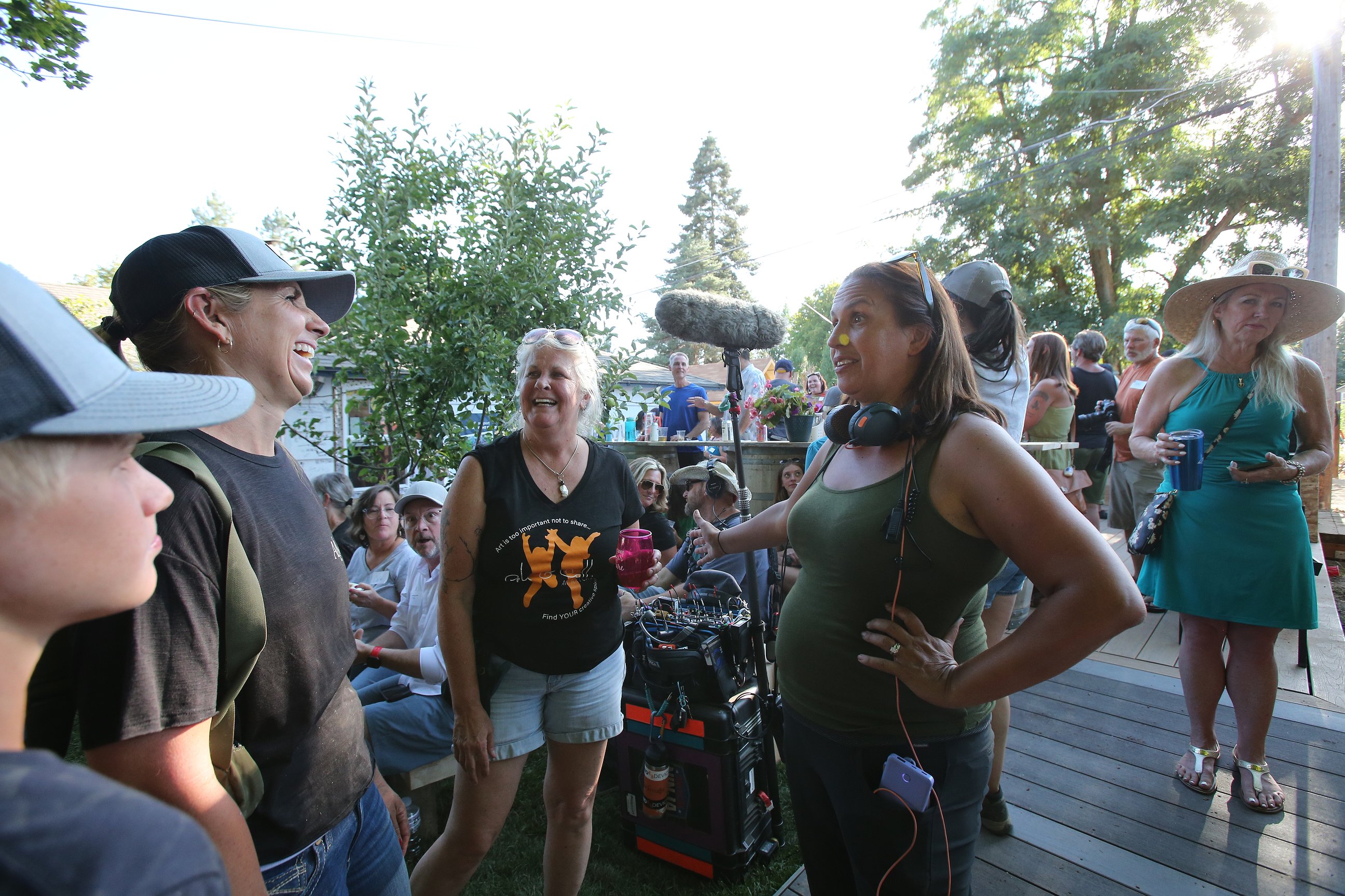 "Ask This Old House" director and producer Rebecca Galvin, right, chats with Adrienne Perkins of AMD Interiors, left, and Ali Shute of Sixtwofour Designs during the 95th Monday Night Dinner. The day was a whirlwind as the film crew captured teams conducting backyard improvement projects, including laying sod, installing bark and building an outdoor kitchen.ARTICLES BY DEVIN WEEKS