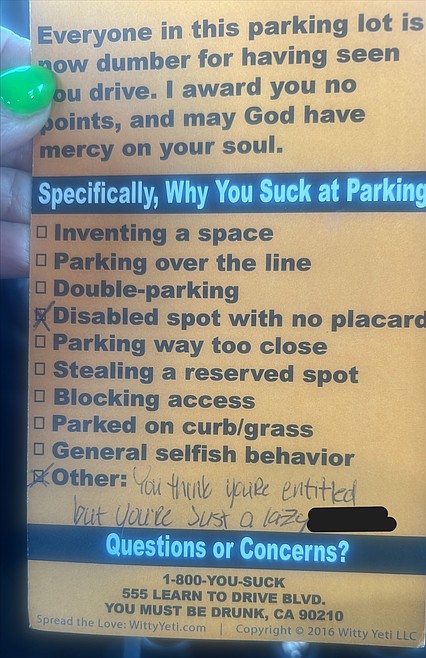 COEUR d’ALENE — When Bethany Stanley returned to her car after shopping at a supermarket this week, the disabled veteran was surprised to see a bright orange card on her windshield that said she “sucks” at parking.