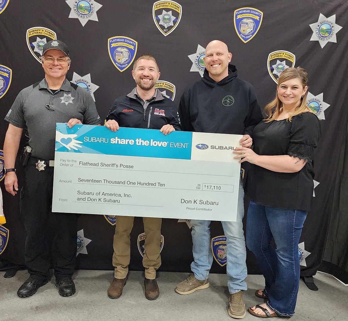Don “K” and Subaru presented a check in the amount of $17,110 to the Flathead Sheriff’s Posse because of their being chosen by the employees at the dealership to become the 2024 hometown charity beneficiary of the recently completed Subaru Share the Love event.