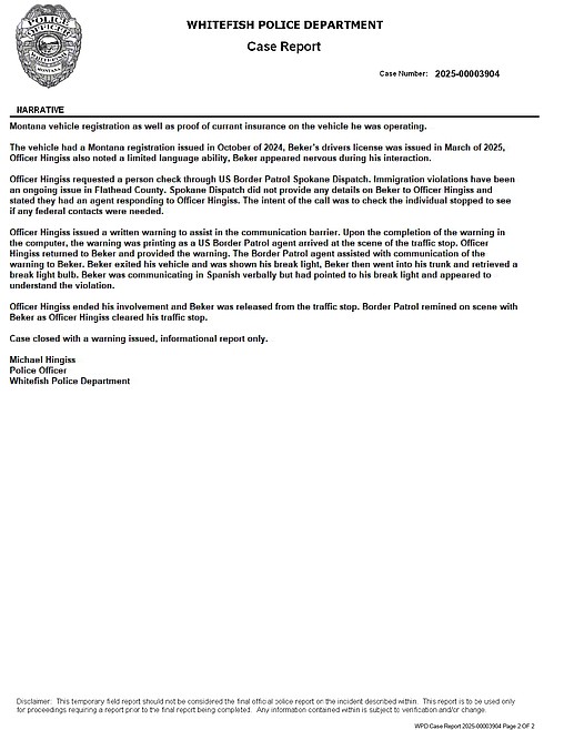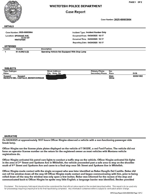 According to the case report, obtained by the Daily Inter Lake, officer Michael Hingiss called the regional dispatch line for U.S. Border Patrol to request “a person check,” even though Beker Rengifo del Castillo had already provided identifying documents, including a driver’s license, vehicle registration and proof of current insurance.