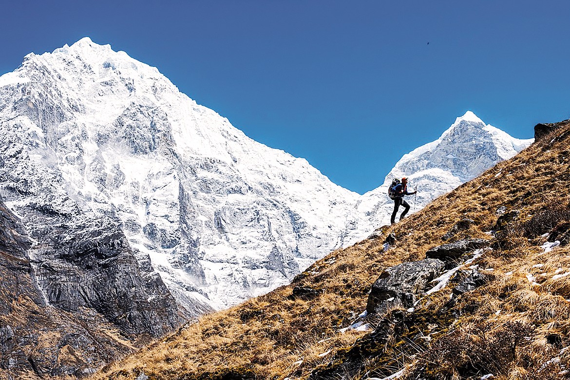 We arrived in Kathmandu, Nepal, with five bulging duffel bags and personal backpacks filled with all the gear needed for a six-week trip in hopes of climbing a new route, alpine style, on Kusum Khanguru’s north side.