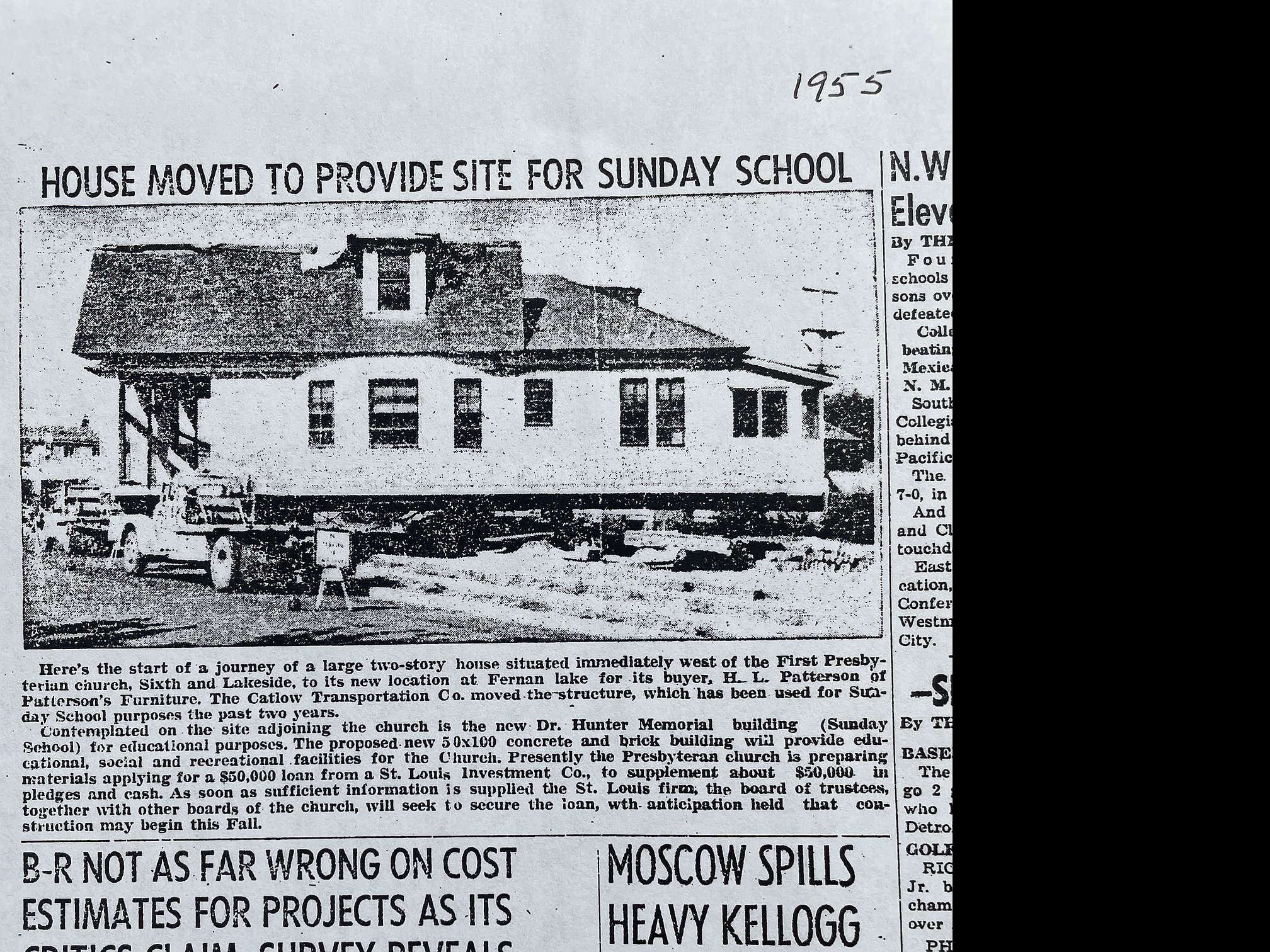 Press clippings show the home was originally located in downtown Coeur d’Alene at Sixth Street and Lakeside Avenue, but it was moved in 1955 to make way for a Sunday school for First Presbyterian Church.