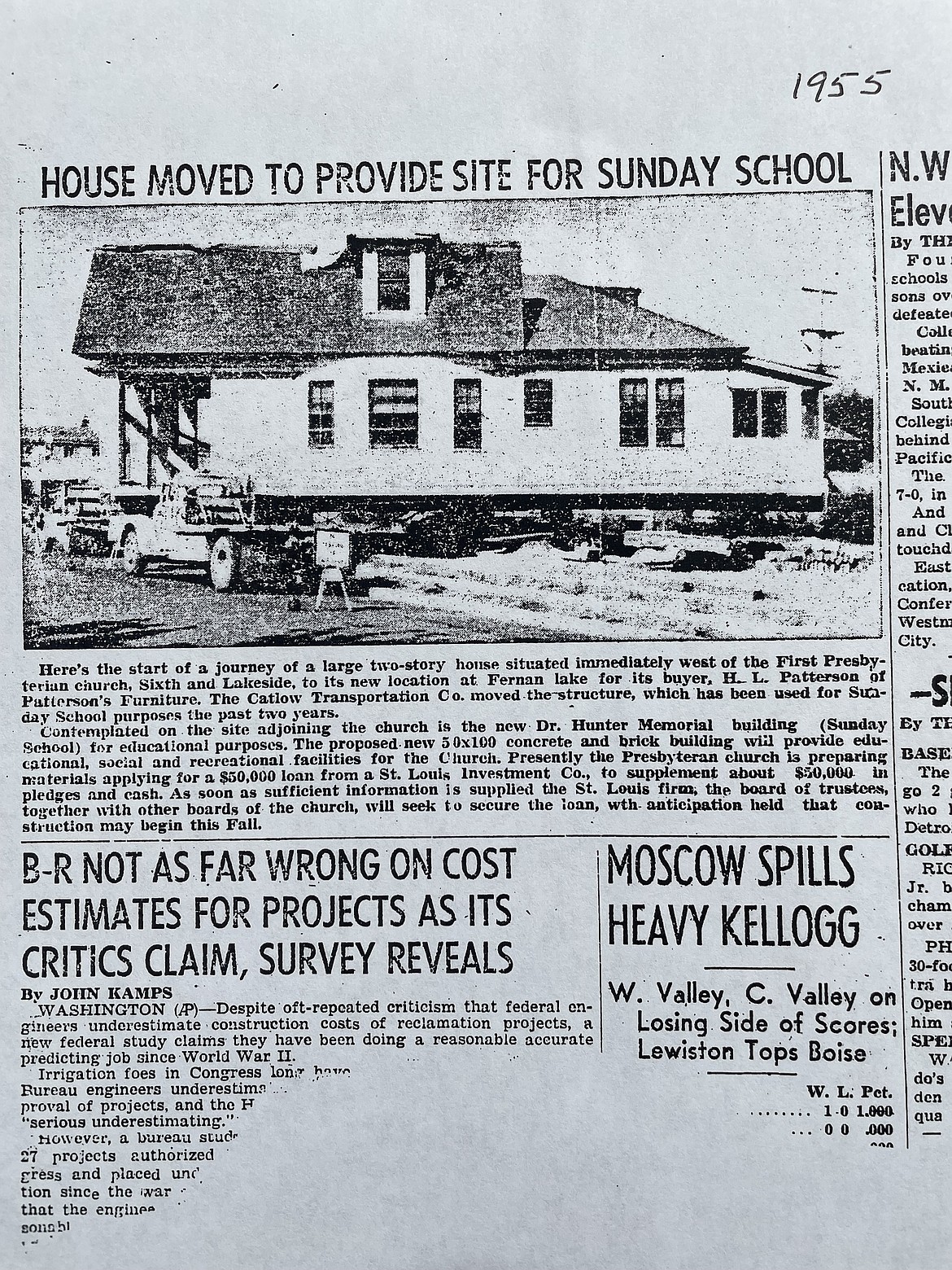 Press clippings show the home was originally located in downtown Coeur d’Alene at Sixth Street and Lakeside Avenue, but it was moved in 1955 to make way for a Sunday school for First Presbyterian Church.