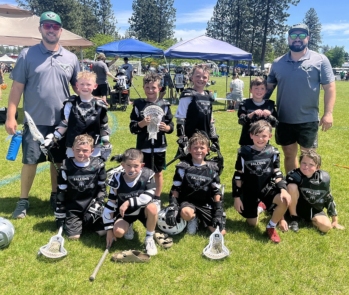 Courtesy photo The North Idaho Youth Lacrosse 1/2 Grade Falcons Boys team wrapped up its season last weekend at the Spokane LaxFest at the Dwight Merkel Sports Complex in Spokane. In the front row from left are Weston Wilson, Van Montgomery, Anderson Perkins, Kai Cullen and Summit Turrell; and back row from left, coach Evan Perkins, Owen RaaeNielson, Henry Dodgion, Jett Tanner, Dakota Russell and coach Chris Montgomery.