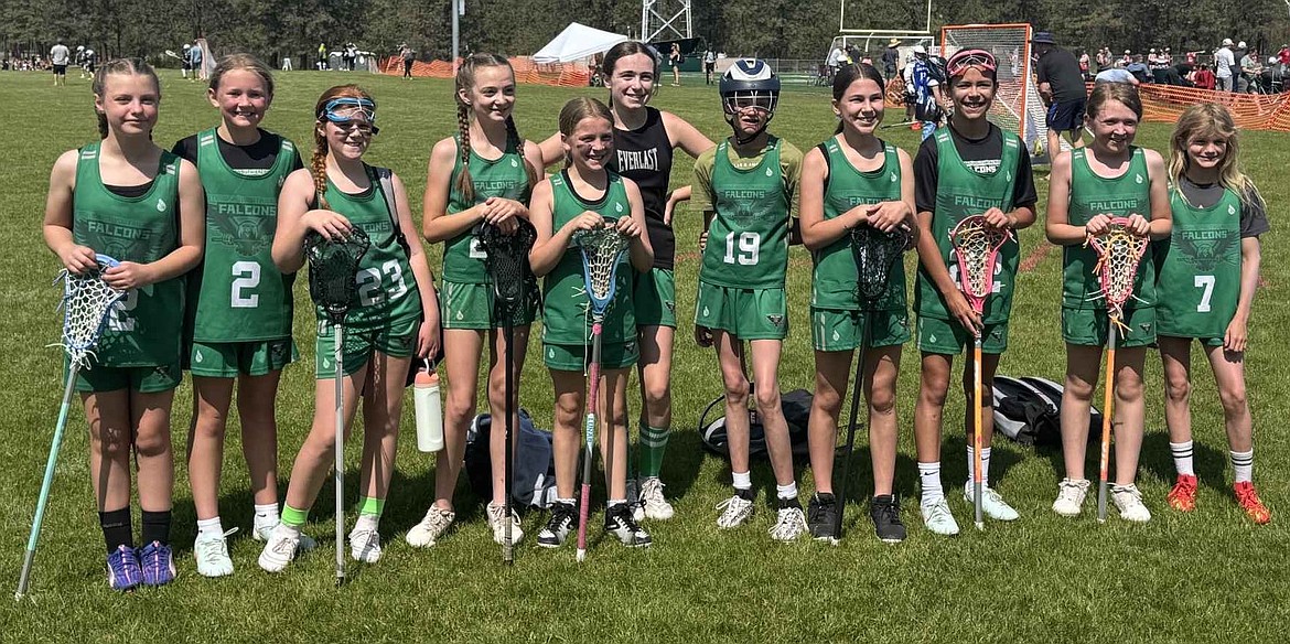 Courtesy photo The North Idaho Youth Lacrosse 5/6 Grade Falcons girls team wrapped up its season at the Spokane LaxFest last weekend at the Dwight Merkel Sports Complex in Spokane. From left are Bailey Walker, Carter Glindeman, McKinley Anderson, Evelynn Osterdock, Audrey Parkinson, Riley Mucciaccio, Julia Clark, Hannah Bassols, Kendall Fierro, Charlie Williams and Corinna Clark.