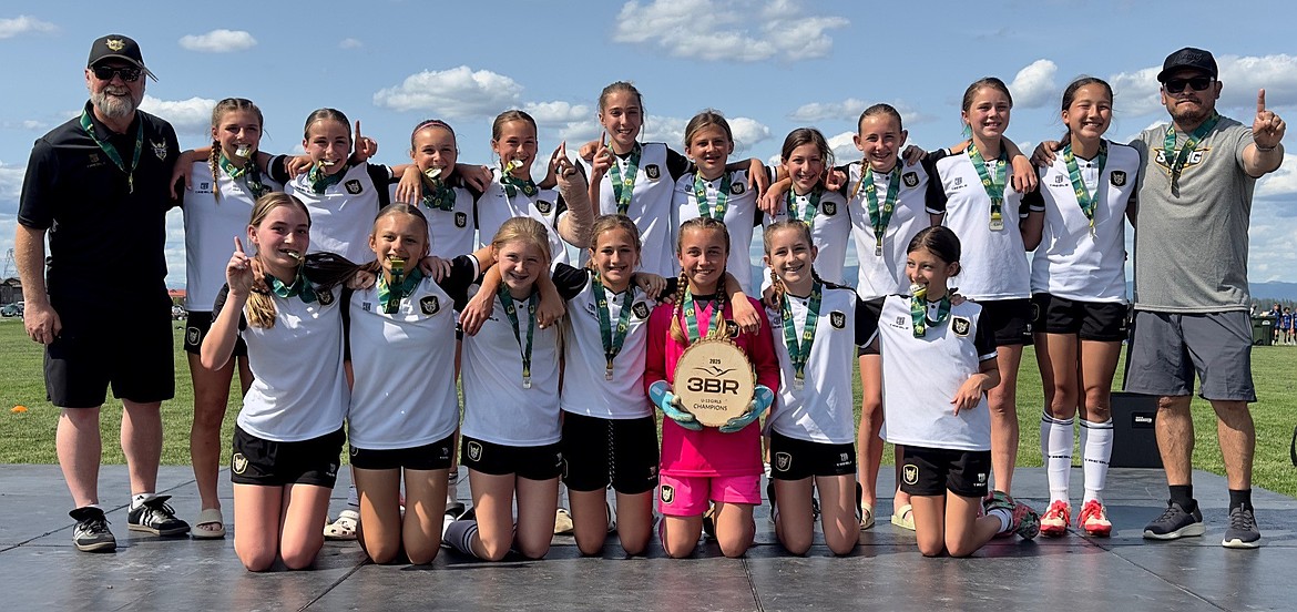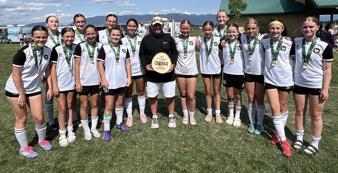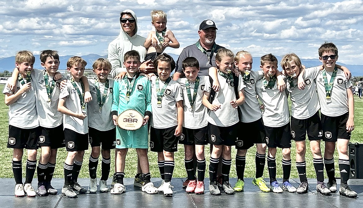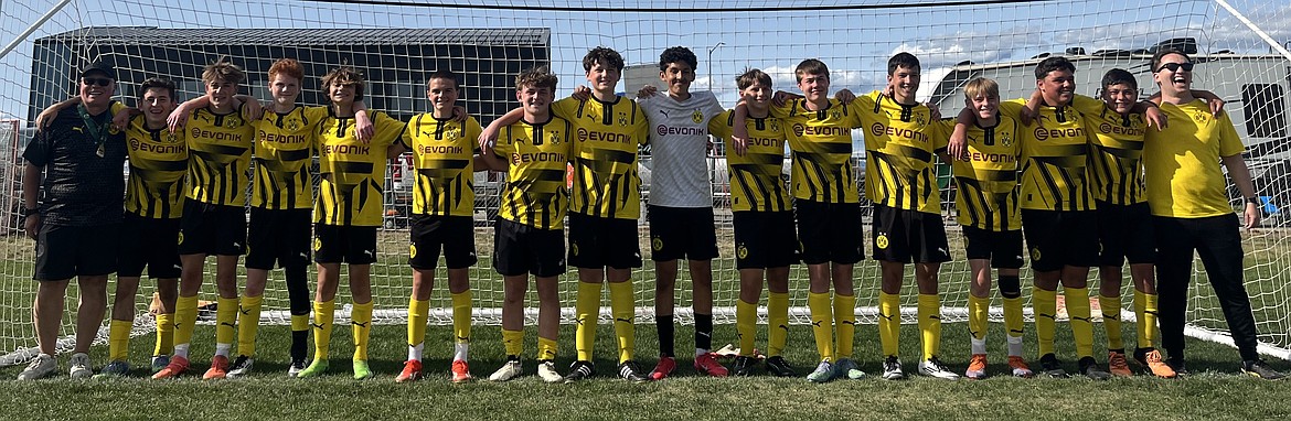 Courtesy photo The BVB IA CDA U15 Boys soccer team traveled to Kalispell, Mont., for the 3 Blind Refs tournament last weekend, winning three matches to earn a spot in the championship final against the Sting. The match ended in a 1–1 draw, but with more points earned throughout the tournament, BVB was crowned champions. From left are John O’Neil (coach), Camden Taylor, Elias Herzog, Soren Vedel, Michael Steffani, Carter Lloyd, Wryder Stone, Logan Siahaya, Sebastian Guitron, Holden Loustalot, Bennett Anderson, Kenton Susca, Xavier Tierney, Ethan MacPherson, Dillon Matheson and Bailey O’Neil (2010 boys coach).
