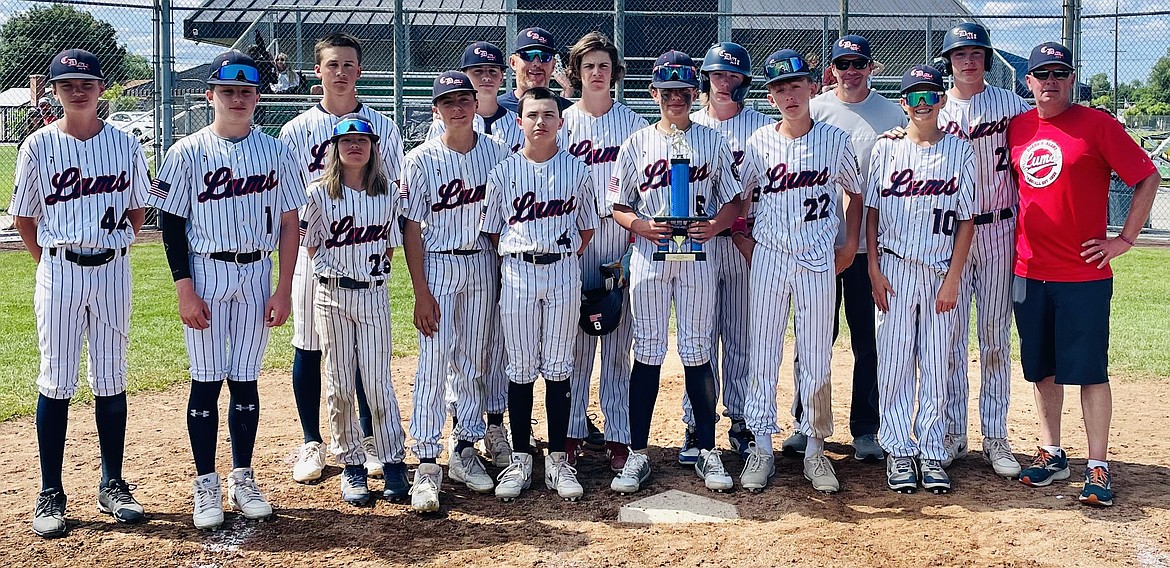 Courtesy photo The 14U Coeur d’Alene Lumbermen baseball team finished in second place last weekend at the Best in the Northwest tournament in Spokane. In the front row from left is Blake Anderson, Kovack Dolan, Jack Kreis, Levi Miller, Nash Russell, Clay Larwin, JJ Larson and Kyle Everson; and back row from left, Cooper Fordham, Ricky Bateman, coach Jon Larson, Caleb Brumbach, Josh Gomez, manager Dave Everson, Trent Lilyquist and coach Jeff Kreis.