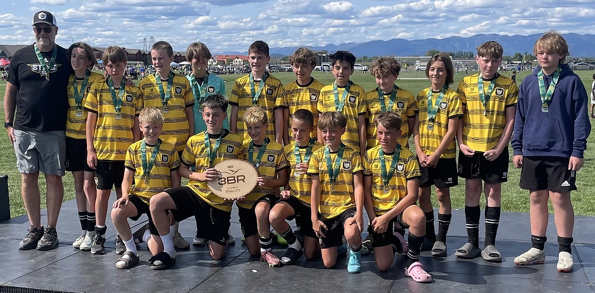 Photo by LINDSEY KNOLL Playing up a year, the 2013 Sting boys Academy soccer team took second place this past weekend at the 3 Blind Refs tournament in Kalispell, Mont., falling to the Sandpoint Strikers 2012B in the final game. In the front row from left are assistant coach Jon Baune, Asher Witherwax, Levi Pooler, Luke Baune, Jonah Wuest and Carter Mitchell; and back row from left, Maverick Sargent, Nolan Bode, Xander Weeks, Crew Kuhlmann, Vance Corbeill, Jasper Meyer, Asher Engles, assistant coach Chad Kuhlmann and Keaton Knoll.