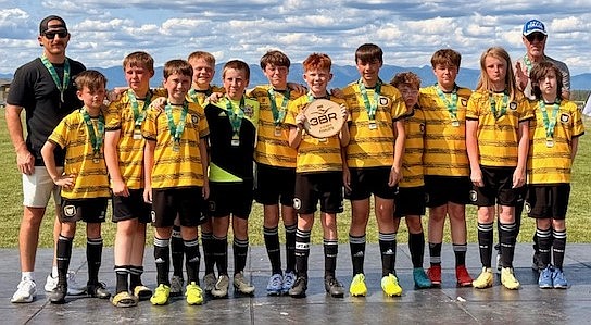 Courtesy photo The Sting Soccer Club 15 boys Yellow team won all its matches in the Gold Bracket and capturing the championship at the 3 Blind Refs tournament in Kalispell, Mont. The Sting defeated the Strikers FC SFC, Missoula Surf, Helena Youth and, in the finals, the Calgary Villains. In the front row from left are Silas Ballou, George Jerkins, Chase Baune, Cooper Corbeill, Harvey Granier, Bam Bookholtz, Thomas Davis, Flynn Bundy, Maddox Hoy, Beckham Sharbono, Henry Hermance and Case Schwarz; and back row, coaches Kip Sharbono and Ian McKenna.