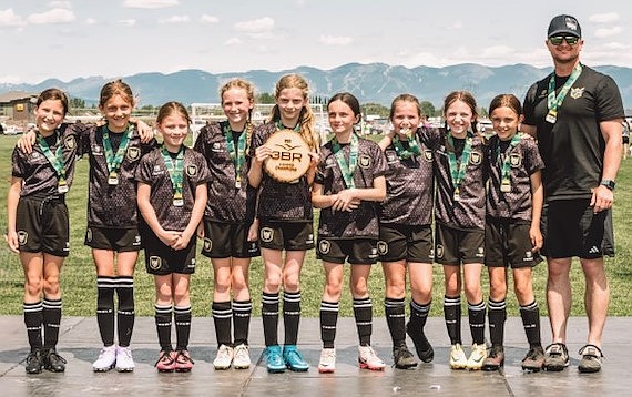 Courtesy photo The Sting SC 2015 yellow girls soccer team took first place at the 3 Blind Refs tournament in Kalispell, Mont., last weekend. From left are Hailey Blue, Callum Chesnut, Hailey Gurgel, Emma Richards, Tatum Chesnut, Addison Conley, Livi Staeheli, Charlotte Denton, Lola Peterson and coach Nate Conley.