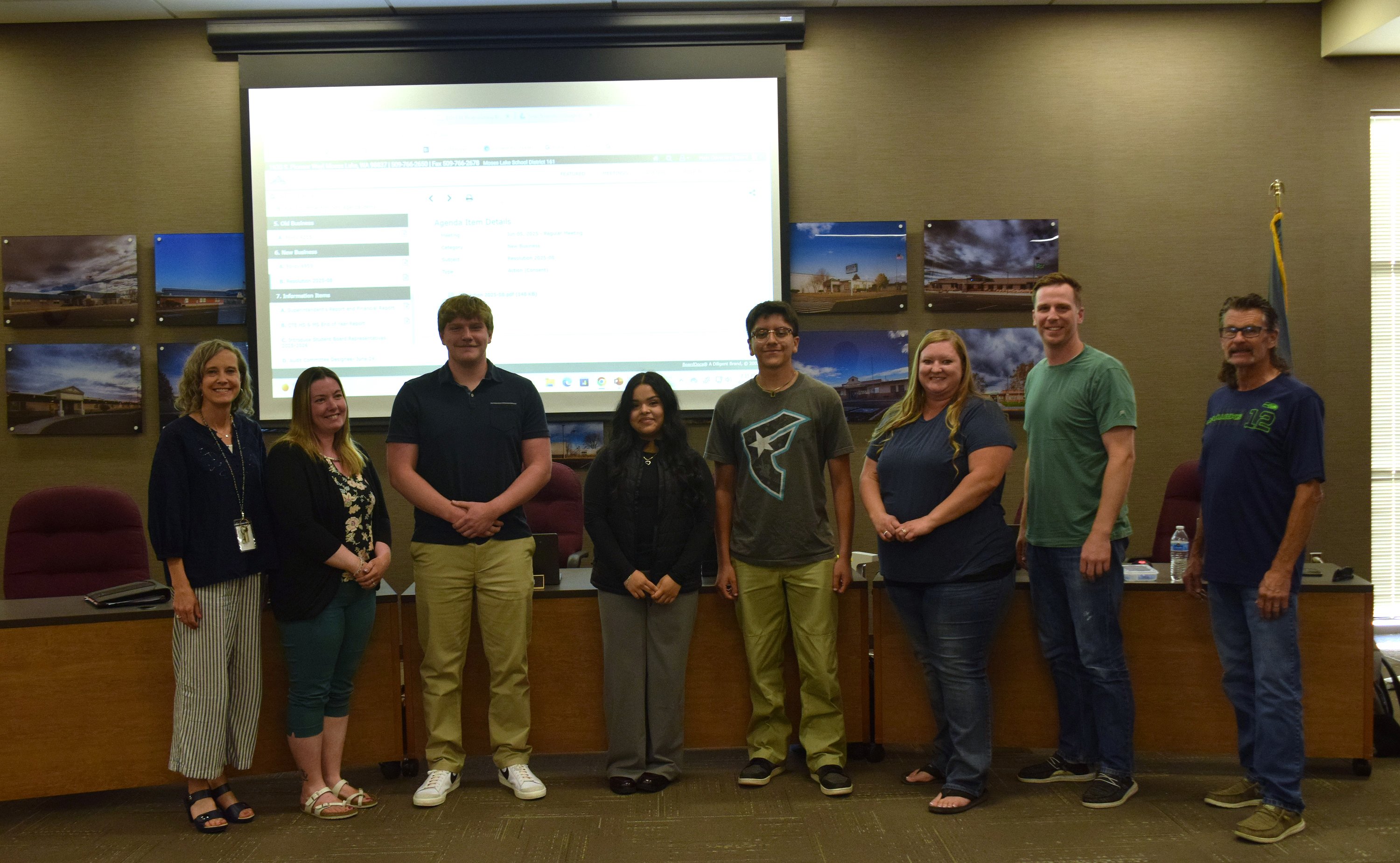 The Moses Lake School Board announced the three new student representatives for the 2025-26 school year. From left to right is Superintendent Carol Lewis, School Board Member Carla Urias, Student Board Representatives Sean King, Emmanuel Zepeda-Lopez and Angie Hernandez, School Board President Kirryn Jensen, School Board Members Ryan Coulston and Paul Hill.ARTICLES BY NANCE BESTON