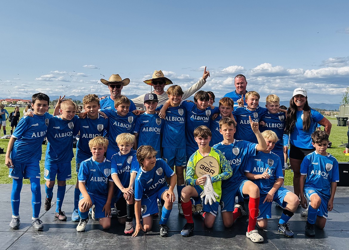 Full caption: Playing in the 2012 age bracket, the Albion SC Sandpoint 2013/14' boys won the U13 Bronze division of the 3BR Tournament held Friday, May 30 through Sunday, June 1 at the Kidsport Soccer Complex in Kalispell, Mont. The team went 4-0 overall, defeating the Sting Soccer Club of Coeur d'Alene by a score of 8-1, the Big Sky Futbol Club of Gallatin County, Mont. 5-0, the Flathead Valley United FC of Kalispell, Mont. 8-0, and the BVB International Academy of Coeur d'Alene 2-0 in the championship match. Matthew McDaniel led the Albion attack, scoring nine goals throughout the tournament. Mason Donenfeld, Sam Sattleen, Aiden Mojzis, Garrison Markwardt and Felix Carlson all scored two goals each. Coach Lawson Tate said midfielder Greyson Reid was stellar in all four games, that Raleigh Brown, Keldon Ridley, Will Hawn, Jacob Moren and Kit Gaddess anchored the defense, and that Griffin Asquith was solid in between the posts, even scoring a goal on a free kick from 28 yards out. "With half of the boys playing up two years, the opponent's size and strength advantage was notable," coach Tate said. "Our boys' tactical game and technical ball skills proved superior. Playing on a full-sized 11 vs. 11 field in the heat was a test for the youngsters and we needed every bit of our deep 18-man roster. The sportsmanship was top notch and we sincerely appreciate the Flathead Valley United crew for hosting such a wonderful event." The team will conclude their spring season at the Kootenay Rovers Classic set to be held Friday through Sunday in both Kimberly and Cranbrook, British Columbia. Pictured, back row, from left are coach Eric Donenfeld, coach Lawson Tate, player Desi Owens, and coach Mike Asquith. Middle row, from left are Raleigh Brown, Porter Reed, Mason Donenfeld, Greyson Reid, Jake Moren, Felix Carlson, Aiden Mojzis, Sam Sattleen, Kit Gaddess, Will Hawn, and coach Jennings Waterhouse. Front row, from left are Benji Munson, Tate Lauper, Matthew McDaniel, Griffin Asquith, Garrison Markwardt, Keldon Ridley and Alex Beteau-Hartman.