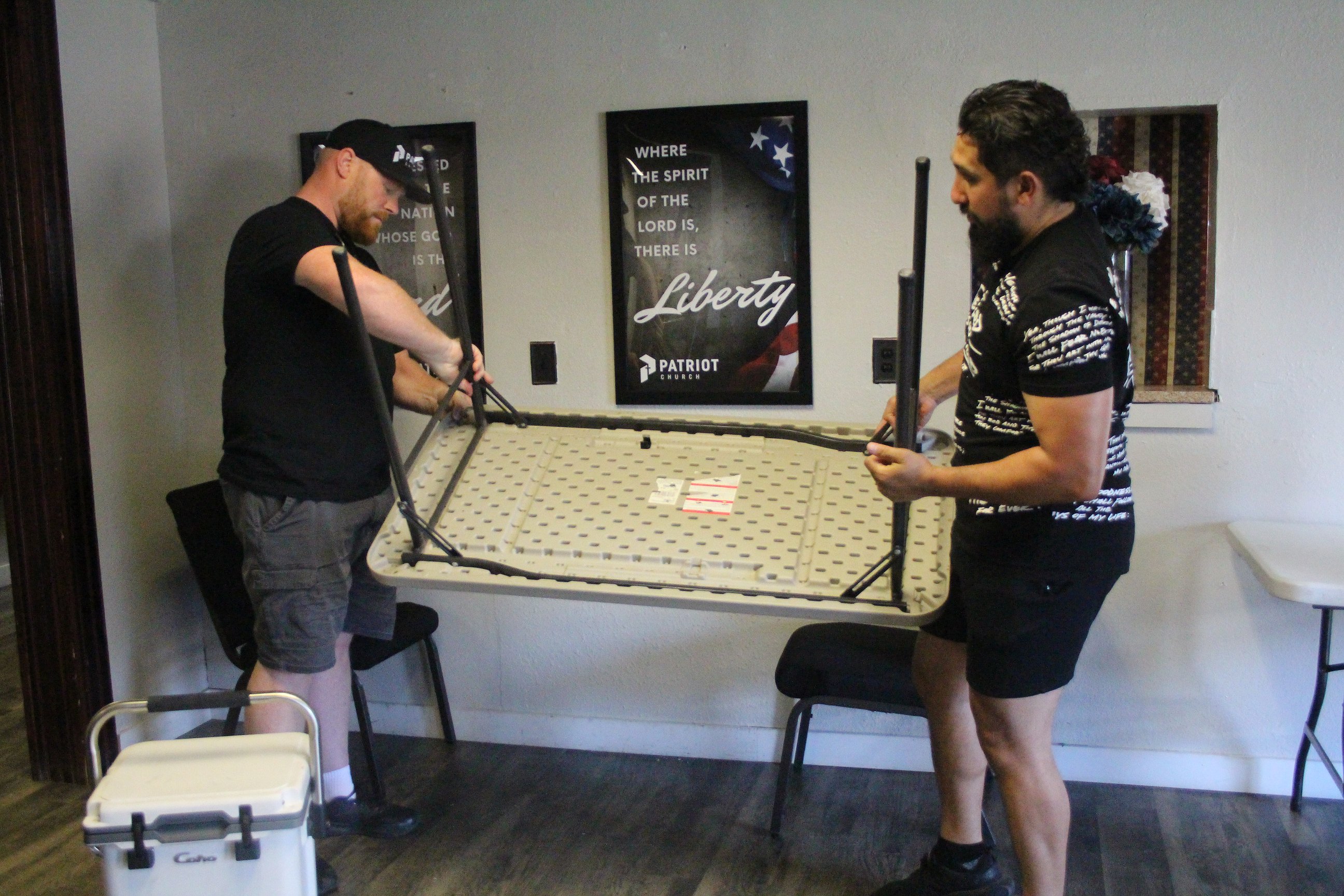 Church members distribute cold water on hot days, along with sack lunches on a regular basis, and have a church service every Sunday night that includes dinner.