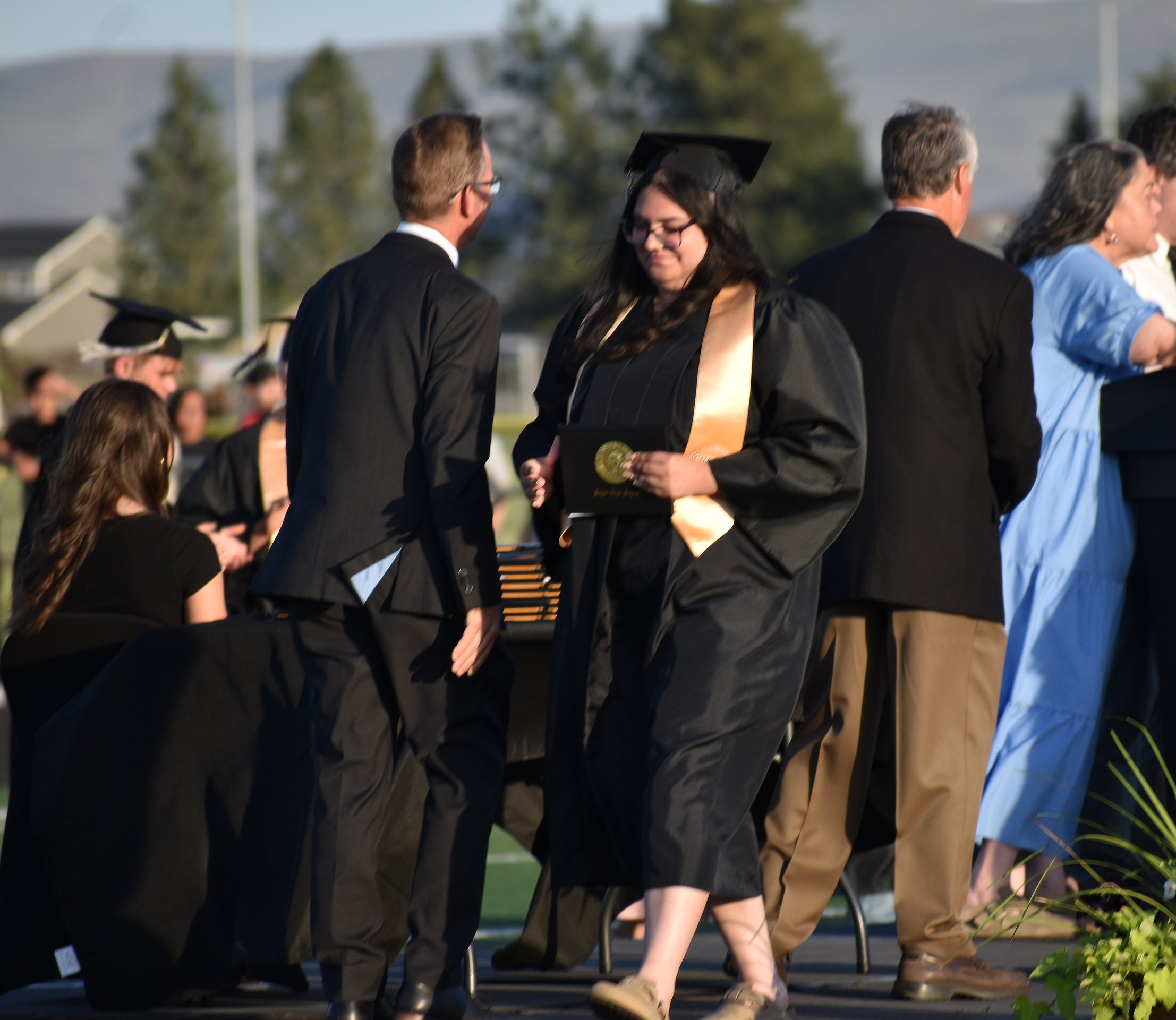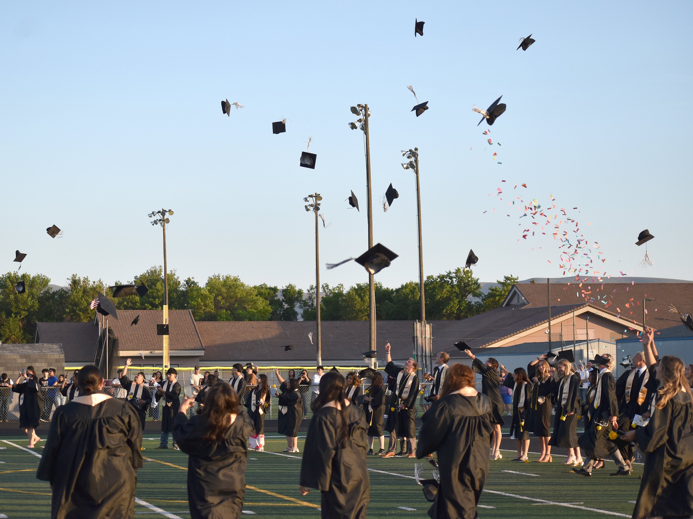The graduation ceremonies at Royal High School began with a senior parade. Students, friends and family gathered in the high school parking lot and, accompanied by fire and police sirens, took one last loop through town in vehicles festooned with banners, flags and streamers. Then the students assembled on the football field as their families watched from the stands.