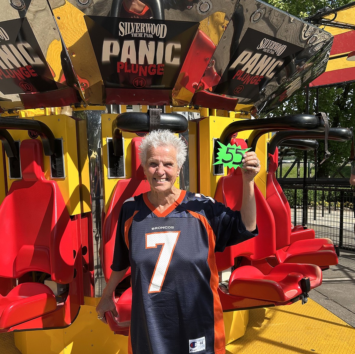 The 72-year-old rode Panic Plunge 60 times in about five hours on a sunny Saturday, beating her best of 50 times in 2023, which smashed her mark of 40 times in 2021.