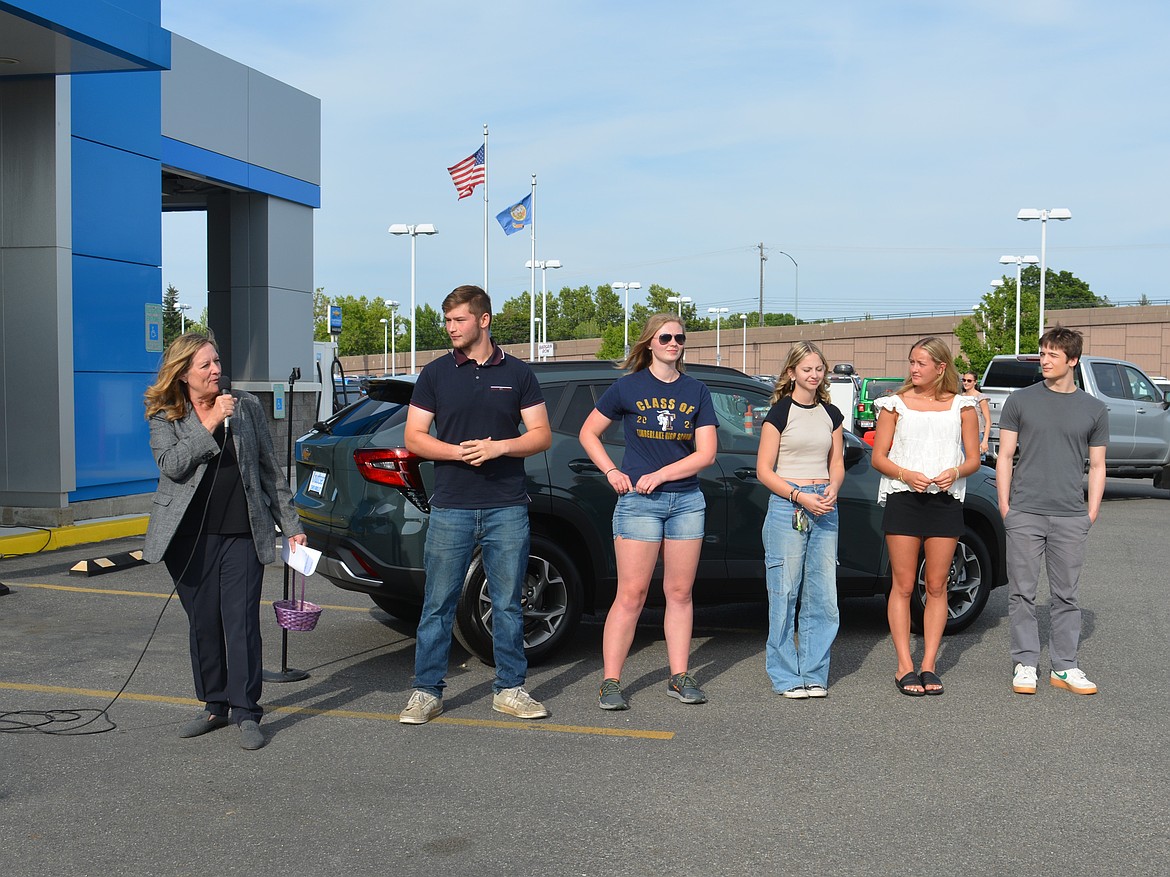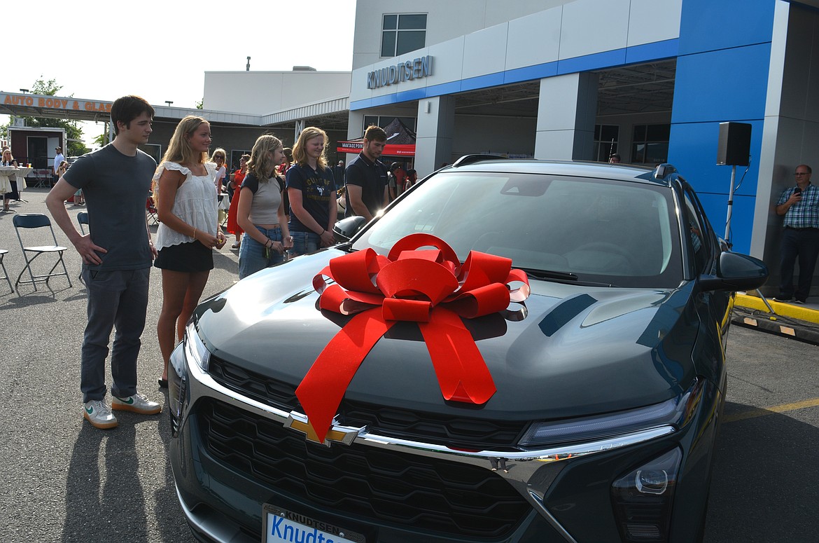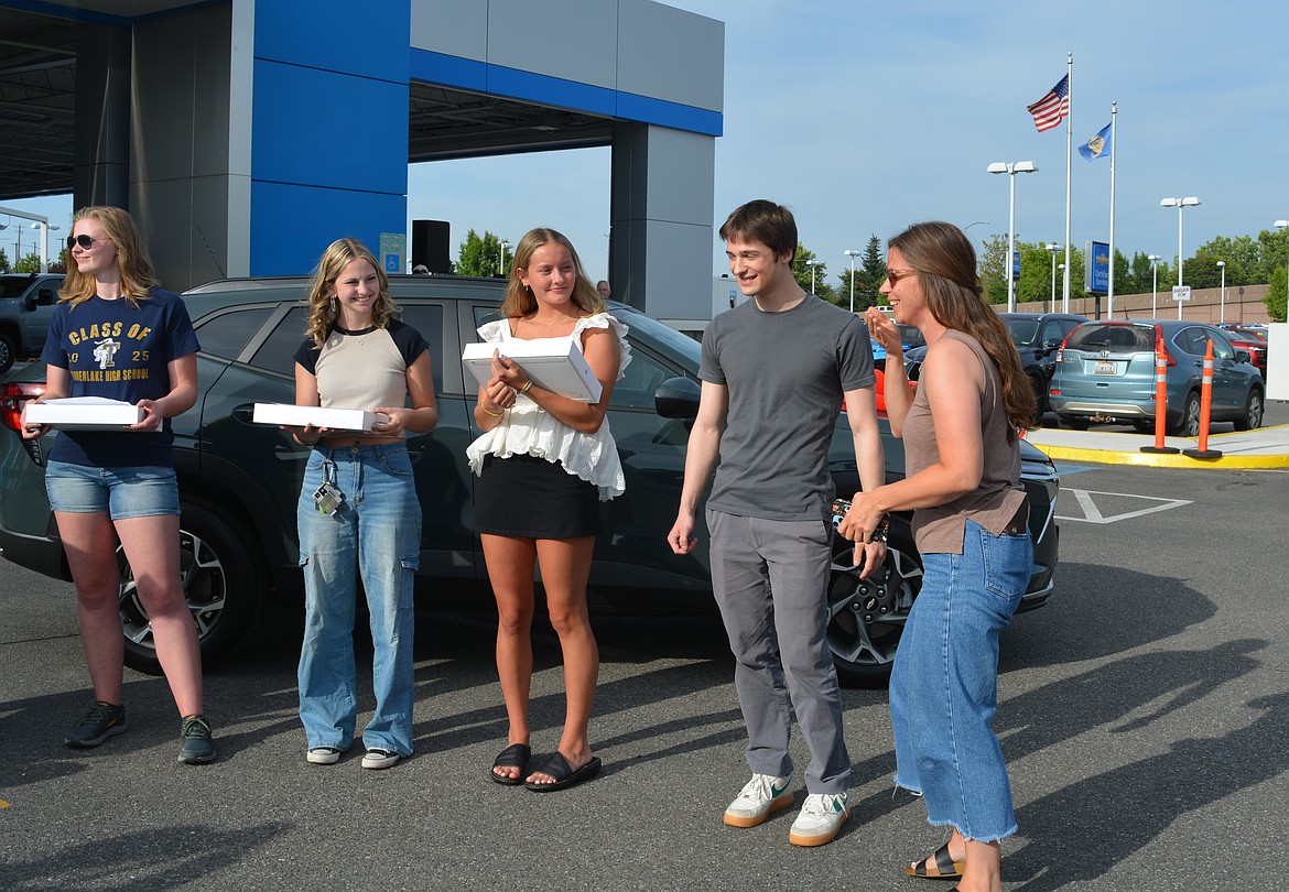 Dealership owner Eve Knudtsen presents the high school seniors with a chance to win a 2025 Chevy Trax on Thursday. Isaac Thorpe, Lola Jeanselme, Emily Lewis, Elizabeth Duce and Sebastean Martin all got a chance to try different keys to draw the car. Coeur d'Alene student Isaac Thorpe was the winner.ARTICLES BY CAROLYN BOSTICK