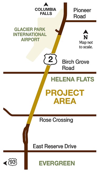 This project begins south of the Rose Crossing intersection and ends just south of the entrance to Glacier Park International Airport. The purpose of this project is to rehabilitate the existing surface to extend its service life, providing a smoother driving surface. Planned improvements include removing and replacing the pavement; adding a seal and cover (chip seal); crack sealing the roadway shoulders and median lane; adding a fog seal; upgrading existing curb ramps at the Rose Crossing intersection; resurfacing the Motor Carrier Services weigh station; electrical upgrades at Birch Grove Road and Rose Crossing intersections; adding shoulder rumble strips, new pavement markings, signage, and roadside delineators; and adding Americans with Disabilities Act upgrades at the intersection with Rose Crossing.