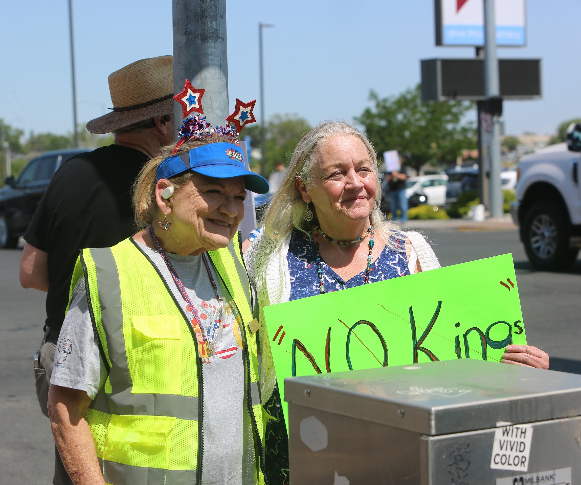 MOSES LAKE – Around 330 people lined East Broadway Avenue and North Stratford Road on Saturday for a “No Kings” protest, according to Grant County Democrat Vice Chair and Protest Co-organizer Jill Springer.