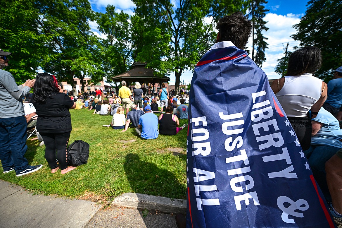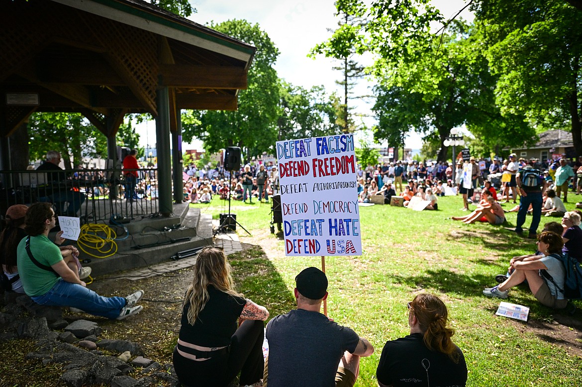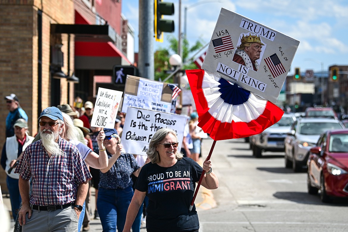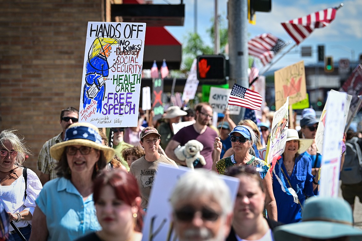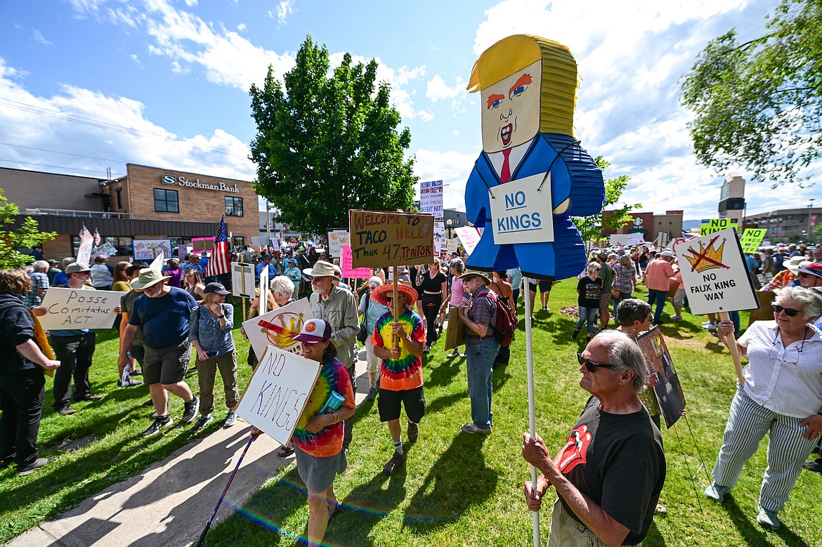 Hundreds of people marched along Main Street and gathered for a "No Kings" protest in Depot Park in Kalispell on Saturday, June 14.