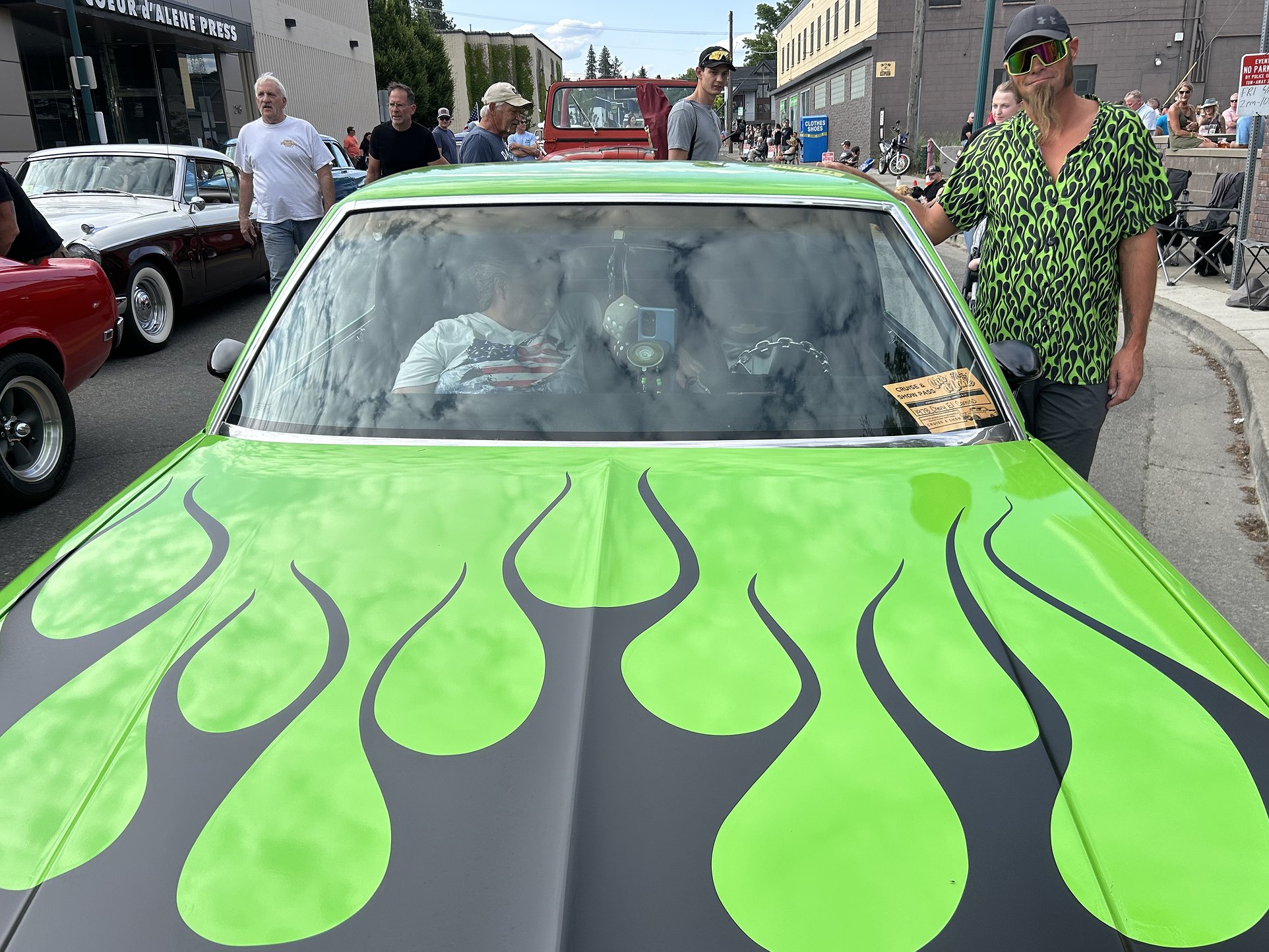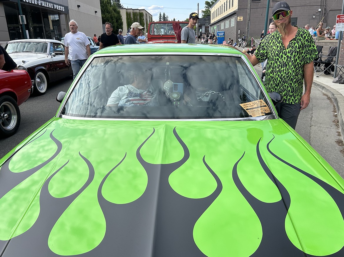 Adam Blair of Coeur d’Alene wore a lime green shirt with black flames to match the paint job on his 1978 Chevrolet El Camino.
