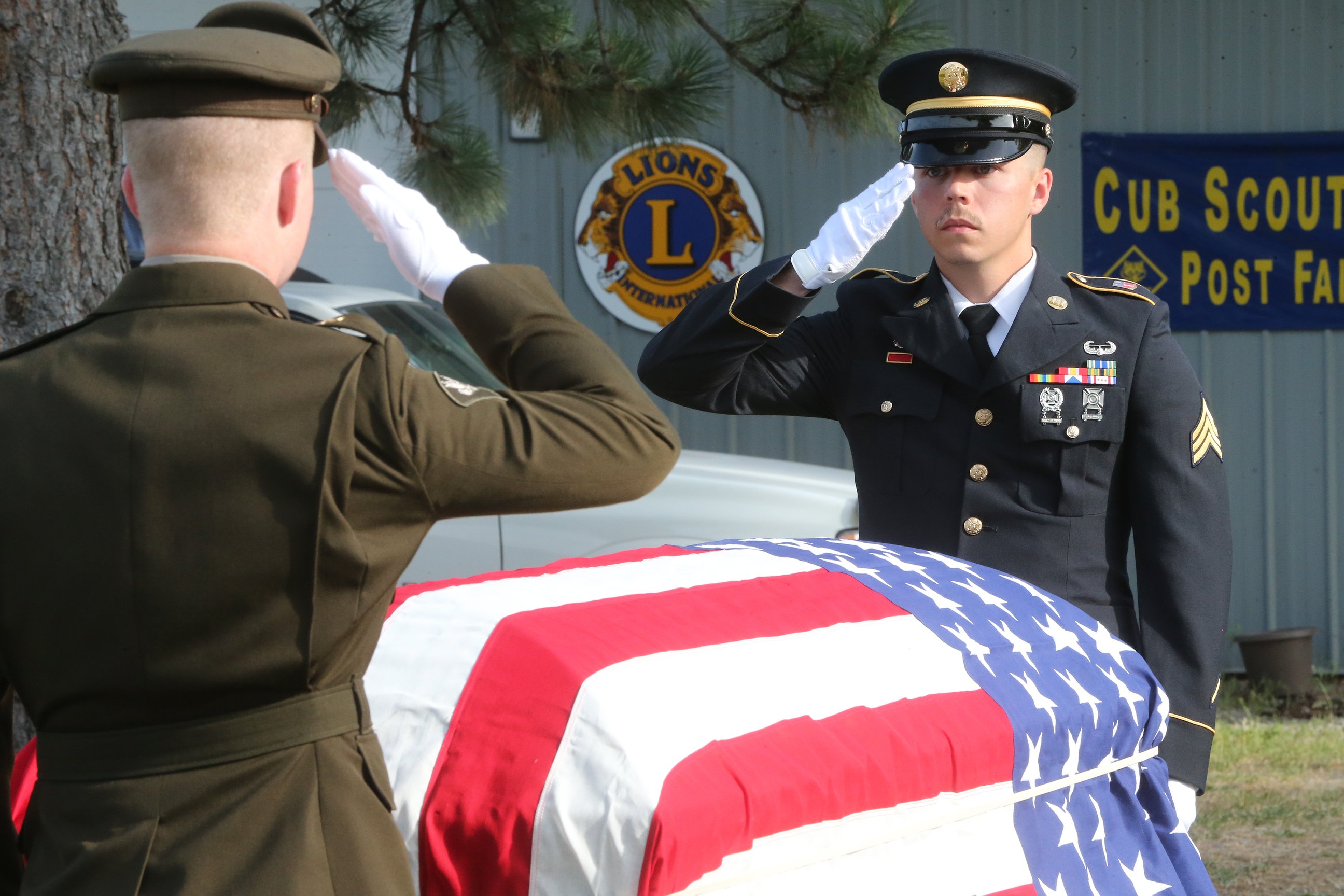 Sentinels from the Idaho Army National Guard salute a flag-draped casket Monday as they perform a military funeral demonstration at the Post Falls American Legion. The Post 143 Honor Guard is actively recruiting volunteers to help with conducting these last respects for military families who wish to lay their loved ones to rest with the dignity they earned while serving their country.ARTICLES BY DEVIN WEEKS