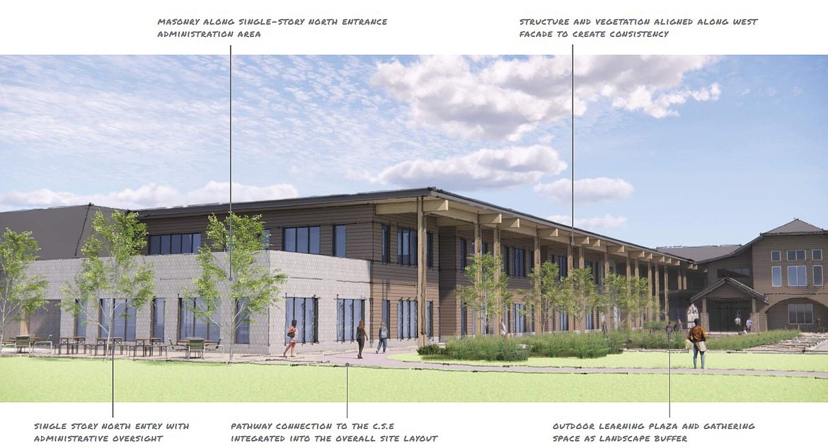 On the exterior, there will be a north entry section of the expansion with garage doors and a covered outdoor learning area for trade classrooms.