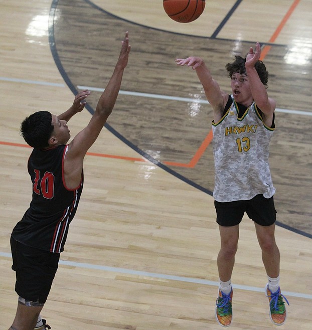 MARK NELKE/Press Kaius Lukey, a rising junior at Lakeland High, puts up a jump shot in a game against Sunnyside (Wash.) at the fifth annual CDA Summer Shootout on Saturday at Post Falls High. The tourney, at several sites in Post Falls, concludes today with bracket play. Schedules can be found at Post Falls High, and also by downloading the TeamSnap Tournaments app and searching for CDA Summer Shootout. Information: cdasummershootout.com