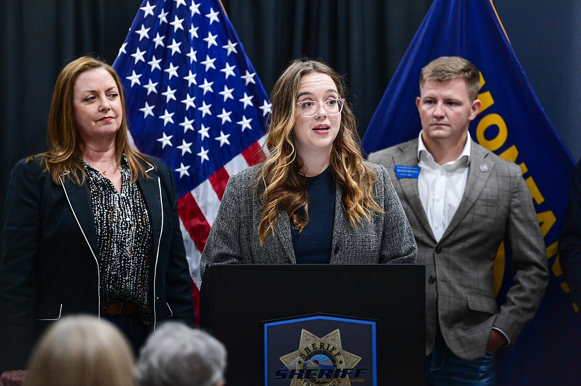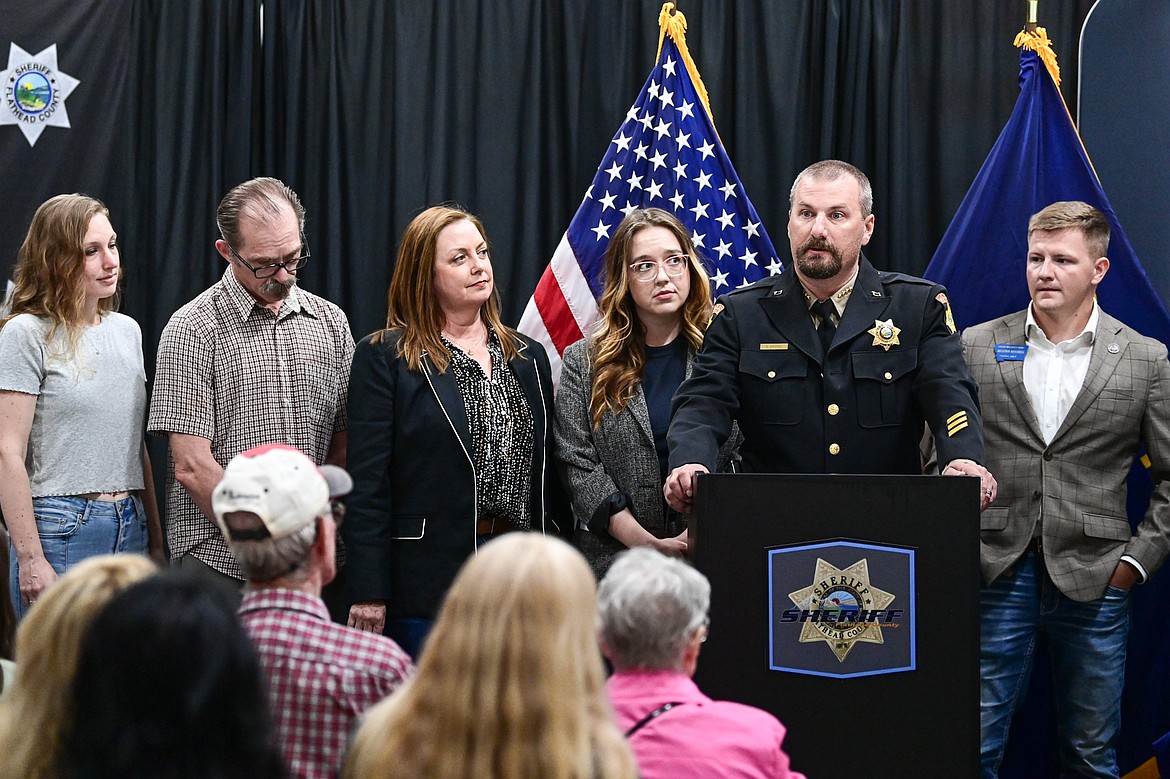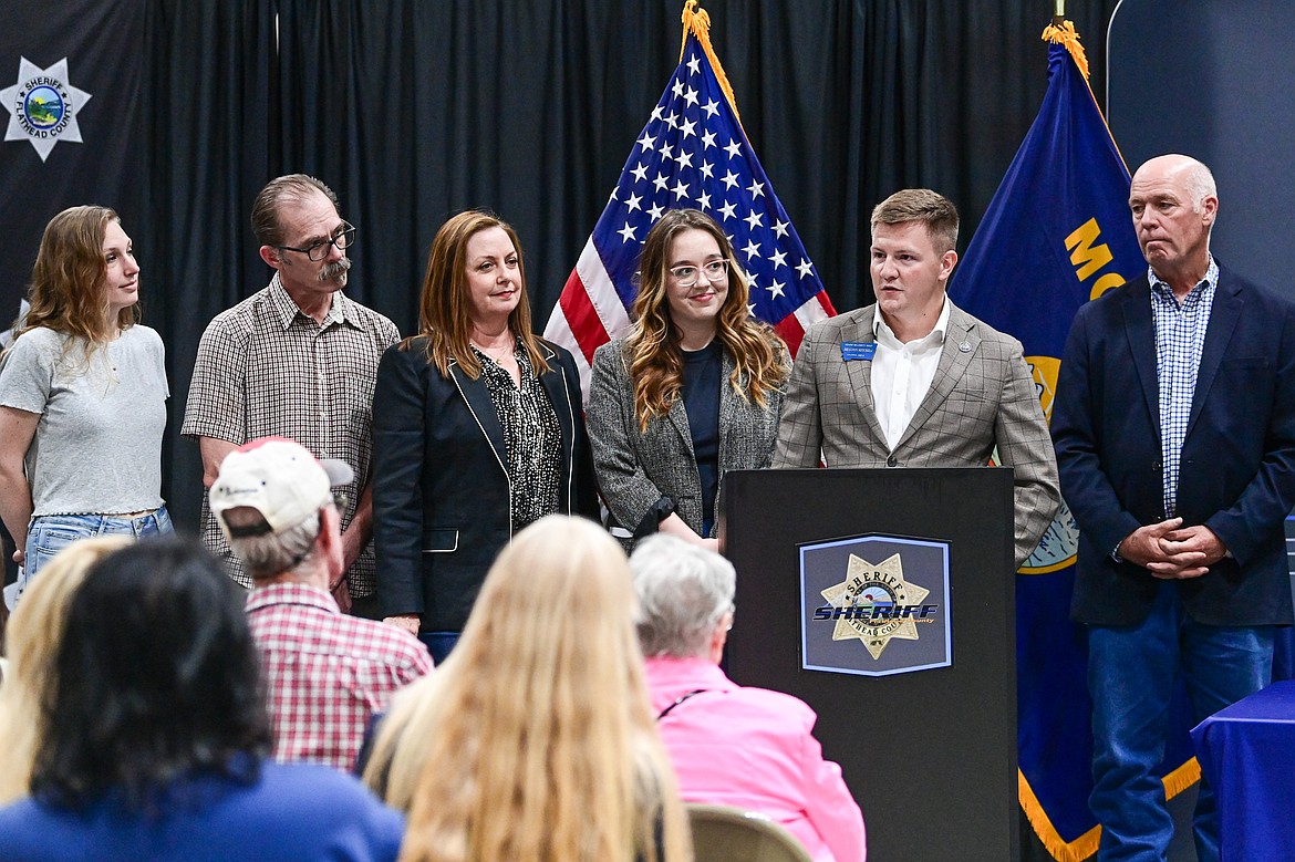 Flathead County Sheriff Brian Heino speaks during a press conference and bill signing for Bobby's Law with family members of Robert "Bobby" Dewbre, at left, and Rep. Braxton Mitchell, right, at the Flathead County Sheriff's Posse headquarters in Evergreen on Wednesday, June 25. (Casey Kreider/Daily Inter Lake)Casey Kreider
