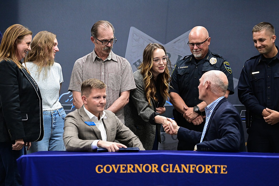 Carli Seymour, sister of Robert "Bobby" Dewbre, shakes hands with Gov. Greg Gianforte after a press conference and bill signing for Bobby's Law at the Flathead County Sheriff's Posse headquarters in Evergreen on Wednesday, June 25. With Seymour are her parents Elizabeth McBride and Rob Dewbre, at left, Rep. Braxton Mitchell, bottom left, Columbia Falls Police Chief Chad Stephens and Kalispell Police Chief Jordan Venezio, at right. (Casey Kreider/Daily Inter Lake)Casey Kreider