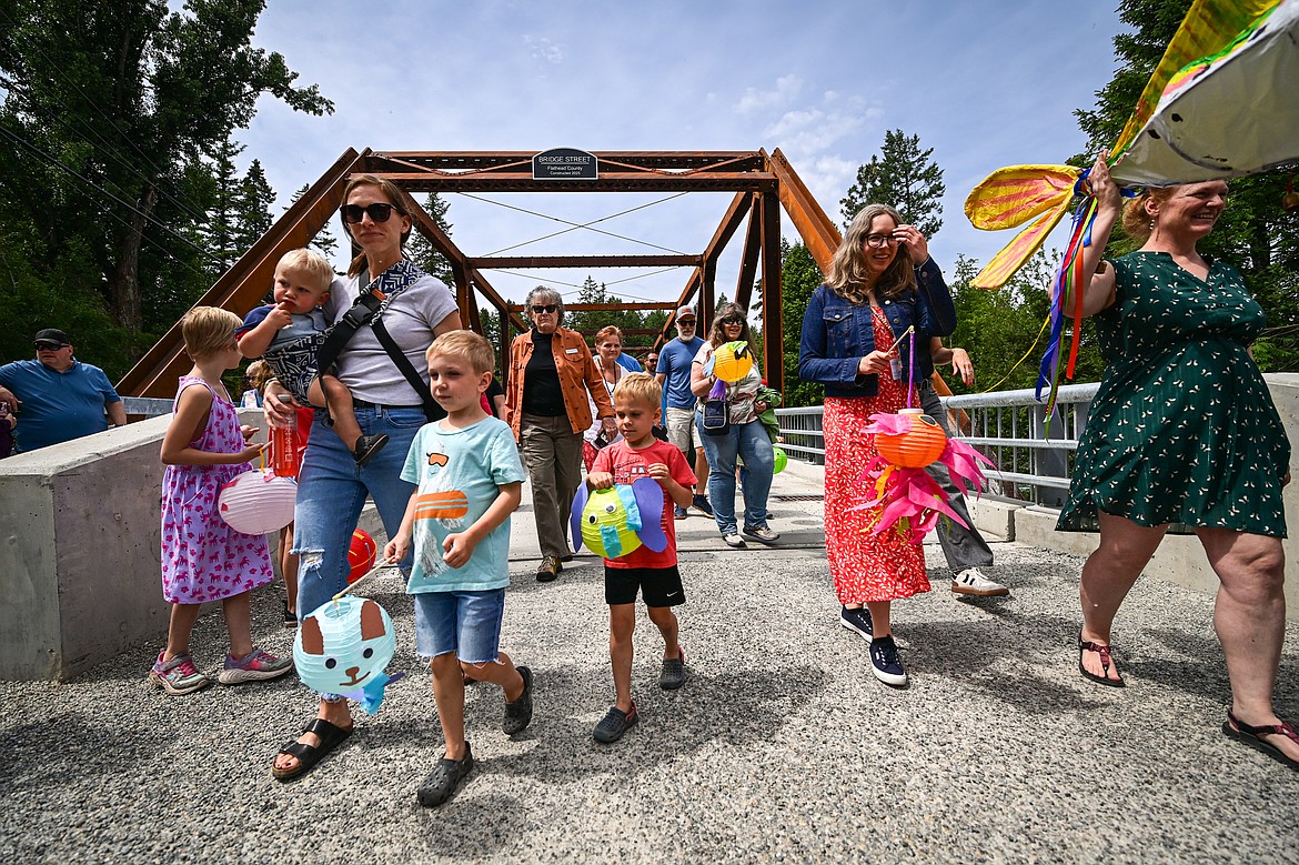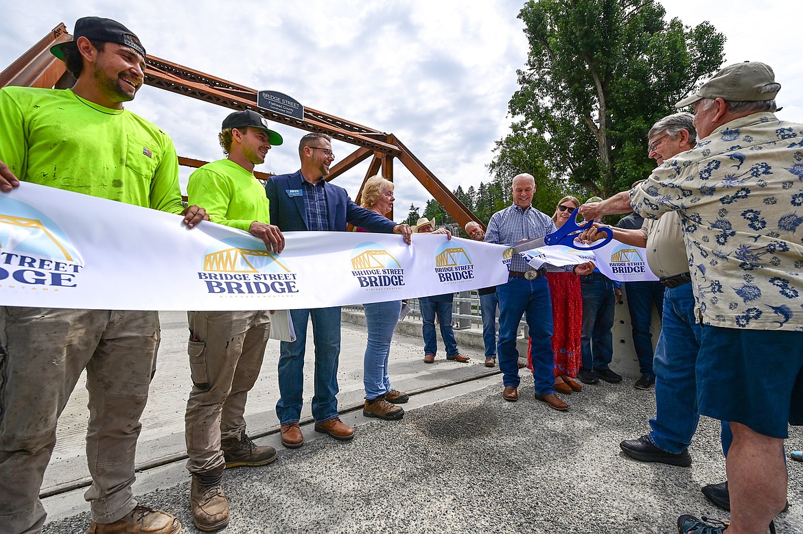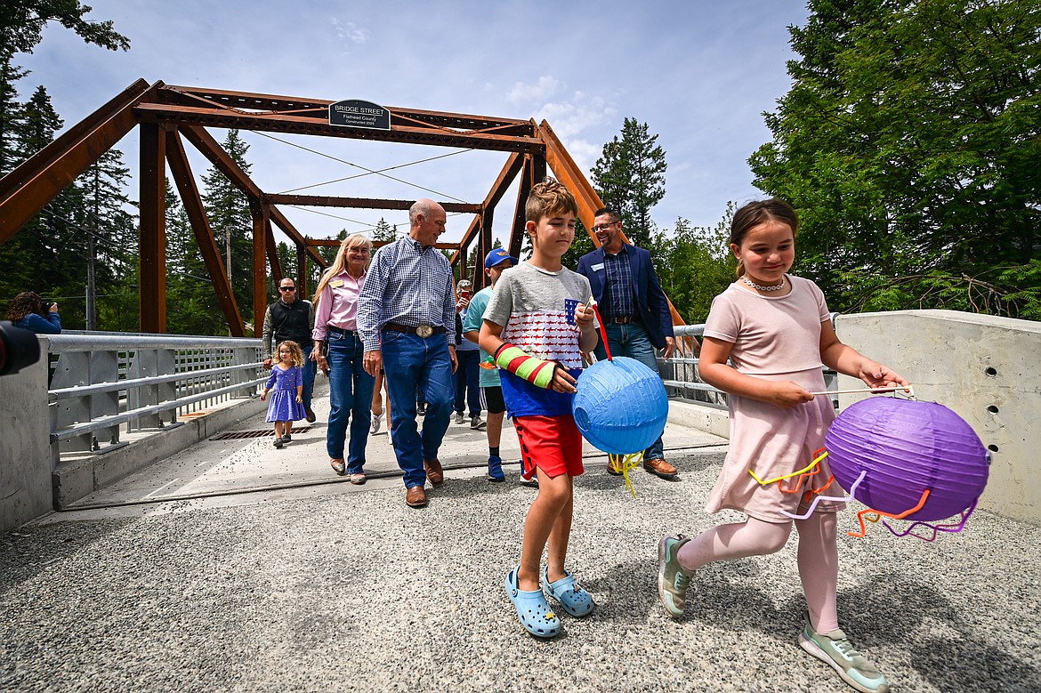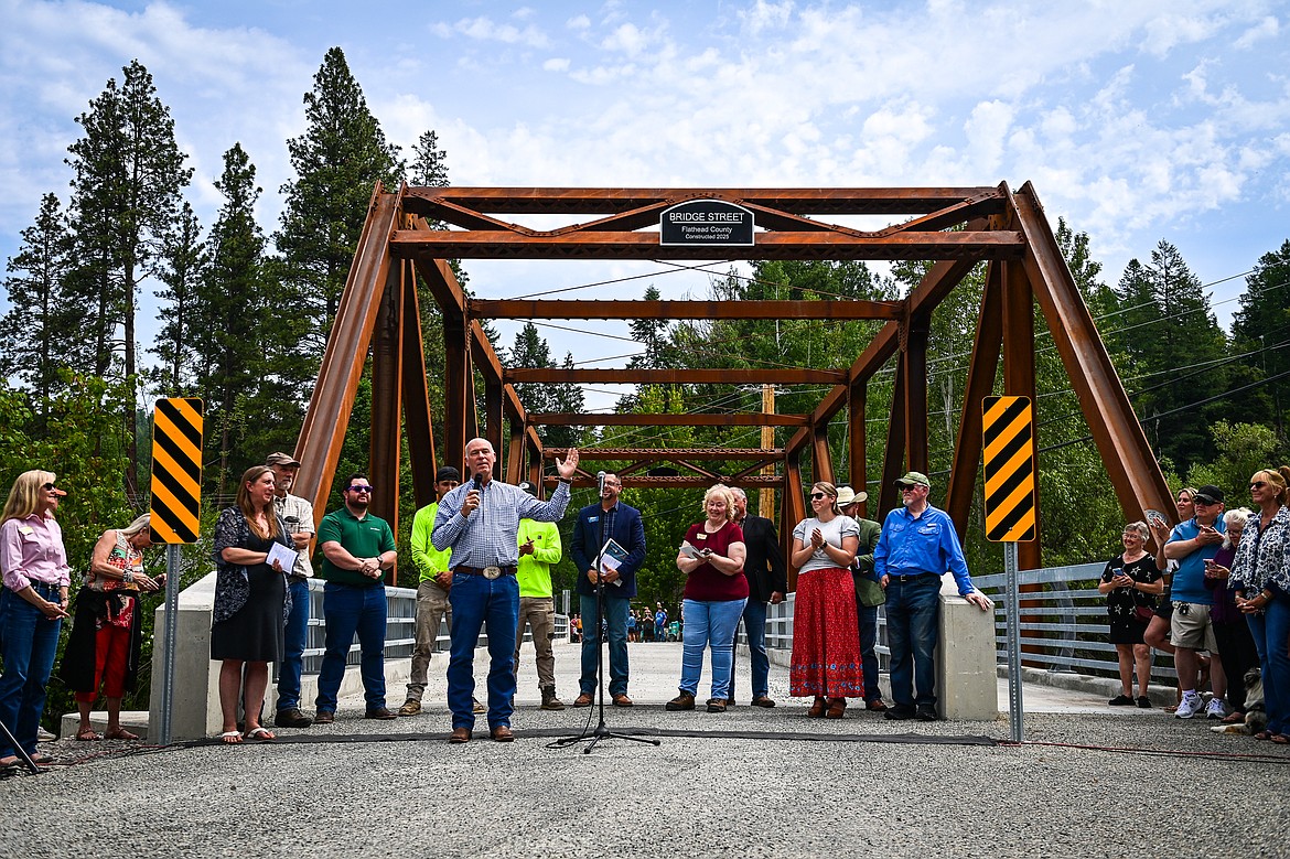 More than a hundred people crowded around the entrance to the new Bridge Street Bridge near Sliter’s Park on Wednesday, where community leaders were joined by Flathead County commissioners, Montana Department of Transportation officials and Gov. Greg Gianforte to celebrate the project’s completion.