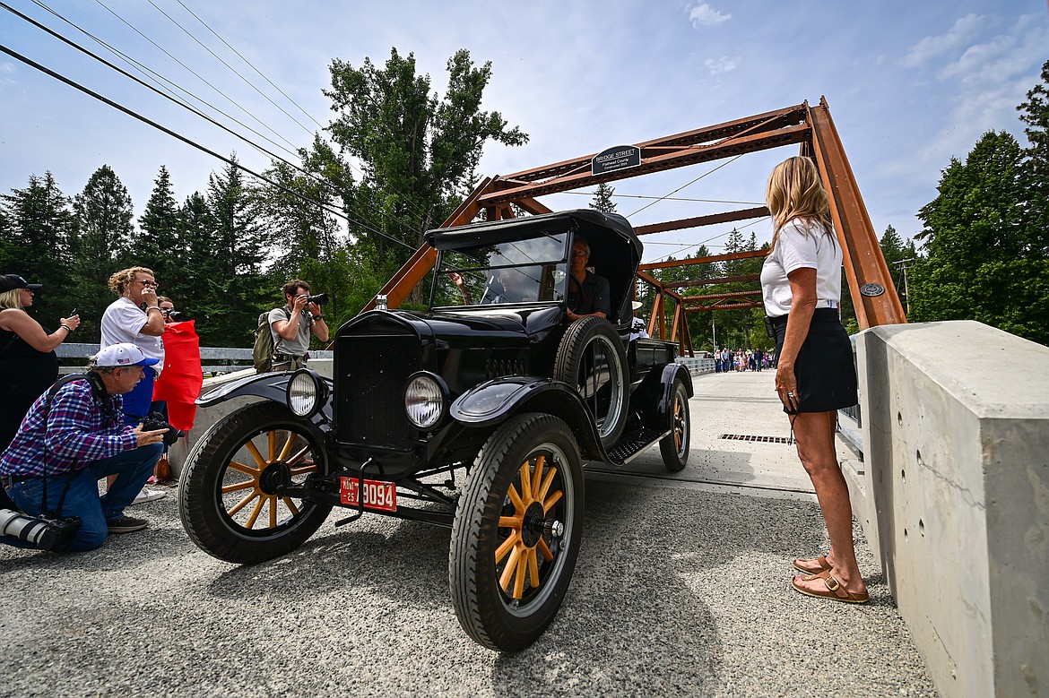 Geoff and Lynn Landon were the first to ride across the new bridge after winning an auction held by the Chamber and the foundation. They were followed by Bigfork’s centenarian, “Uncle” Bud Robinson, riding in a 1925 car, followed by a lantern parade led by the Bigfork Library.