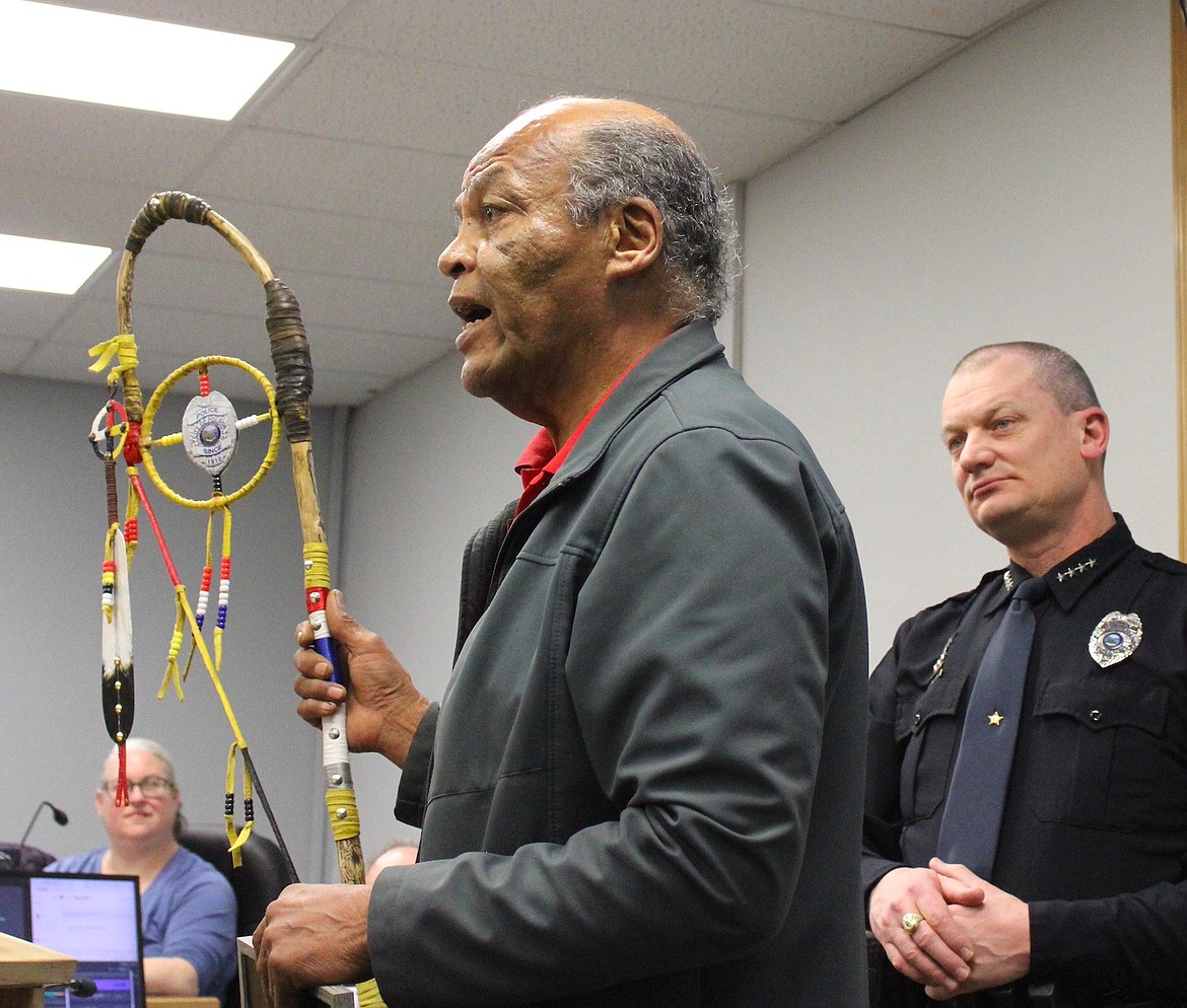 The Polson City Commission meeting on March 3 started a little differently than usual as Ken Camel stepped to the lectern. Camel came bearing the gift of a coup stick – also known as a greeting stick – for Polson Police Chief George Simpson.