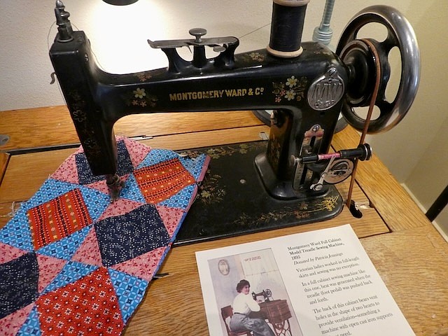 Enhancing the exhibit is an 1895 Montgomery Ward cabinet model treadle sewing machine. This machine is unique in that the back of the cabinet bears vent holes in the shape of two hearts to provide ventilation — something a machine with open cast iron supports did not need.