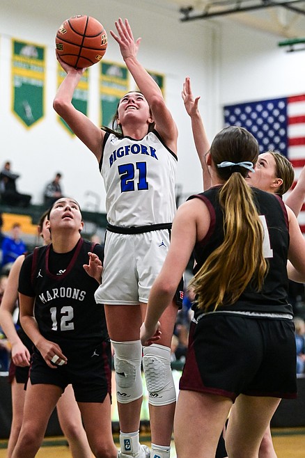 Bigfork's Keni Wade (12) shoots against Columbia Falls in the consolation game of the Western A Divisional Basketball Tournament at Whitefish High School on Saturday, March 8. (Casey Kreider/Daily Inter Lake)