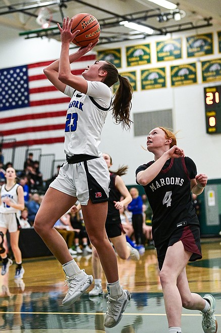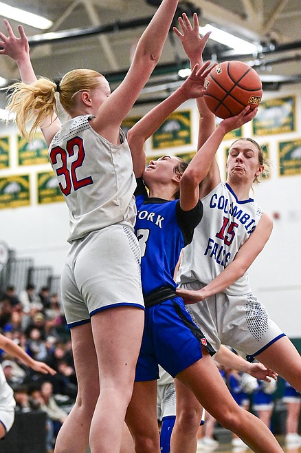 Bigfork's Paeten Gunlock (23) drives to the basket between Columbia Falls' defenders Rylee Sweeney (32) and Taryn Borgen (15) in the consolation game of the Western A Divisional Basketball Tournament at Whitefish High School on Saturday, March 8. (Casey Kreider/Daily Inter Lake) Casey Kreider