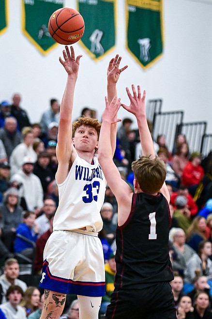 Columbia Falls' Grady Hutton (33) knocks down a three in the first half against Butte Central at the Western A Divisional Tournament at Whitefish High School on Thursday, March 6. (Casey Kreider/Daily Inter Lake) Casey Kreider