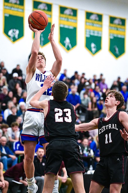 Columbia Falls' Reggie Sapa (22) shoots in the first half against Butte Central at the Western A Divisional Tournament at Whitefish High School on Thursday, March 6. (Casey Kreider/Daily Inter Lake) Casey Kreider