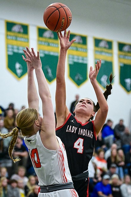 Browning's Shaylee Heavy Runner (12) blocks a shot by Frenchtown's Maya Skinner (14) in the first half at the Western A Divisional Tournament at Whitefish High School on Thursday, March 6. (Casey Kreider/Daily Inter Lake)