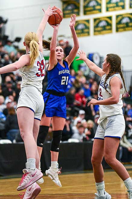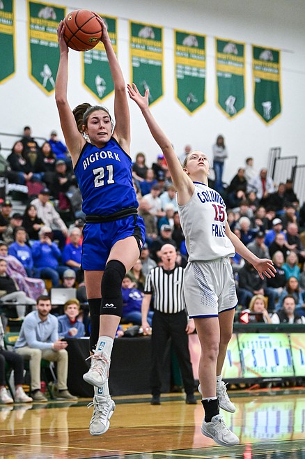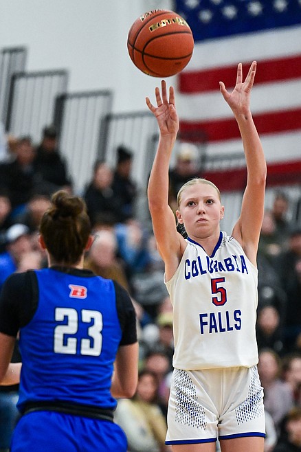 Columbia Falls' Onnikka Lawrence (5) shoots in the first half against Bigfork in the consolation game of the Western A Divisional Basketball Tournament at Whitefish High School on Saturday, March 8. (Casey Kreider/Daily Inter Lake) Casey Kreider