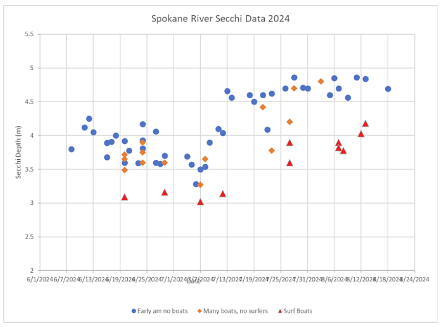 During data collection on a busy day in 2024, Wilhelm's team counted 900 boats over 12 hours on the Spokane River. While more data is needed, preliminary results suggest water quality is generally better before a boat passes than afterward, regardless of wake type.